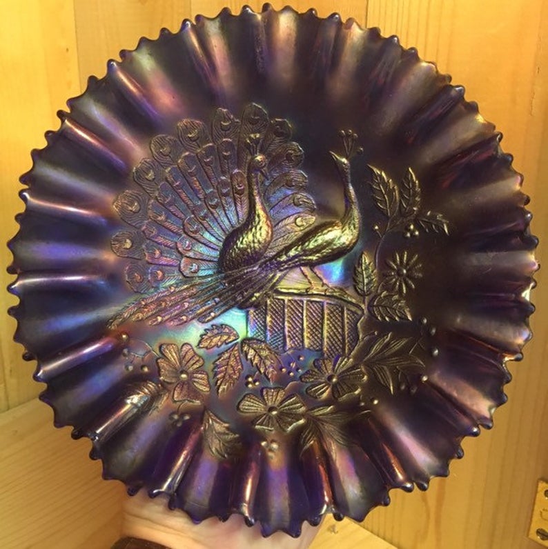 Beautiful Northwood Carnival Glass Bowl with Two Peacocks Atop a Fence, Iridescent Purple Glass