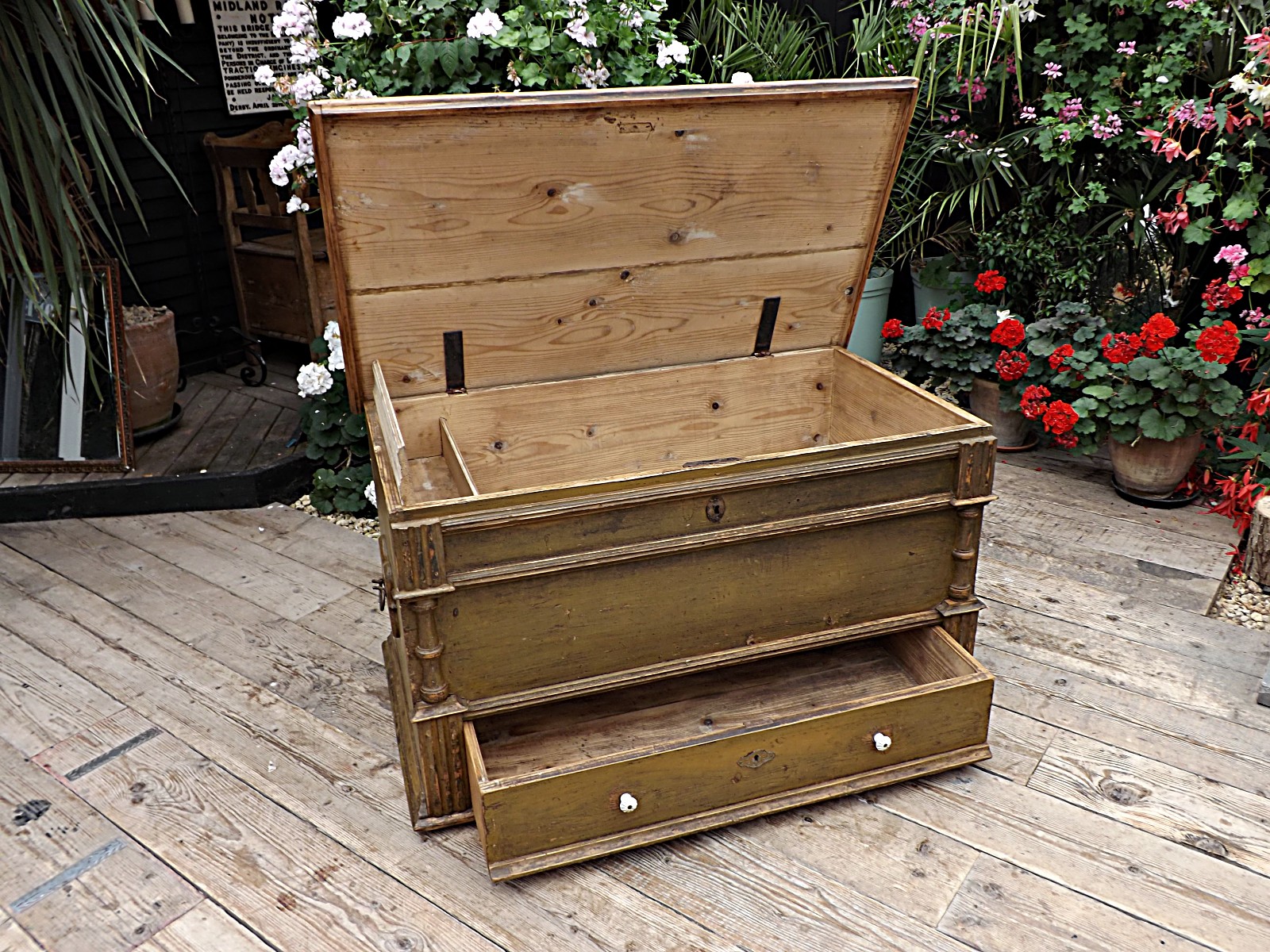 Beautiful Old Antique Pine / Painted Green / Mustard Blanket Box / Mule Chest / Trunk - We Deliver!