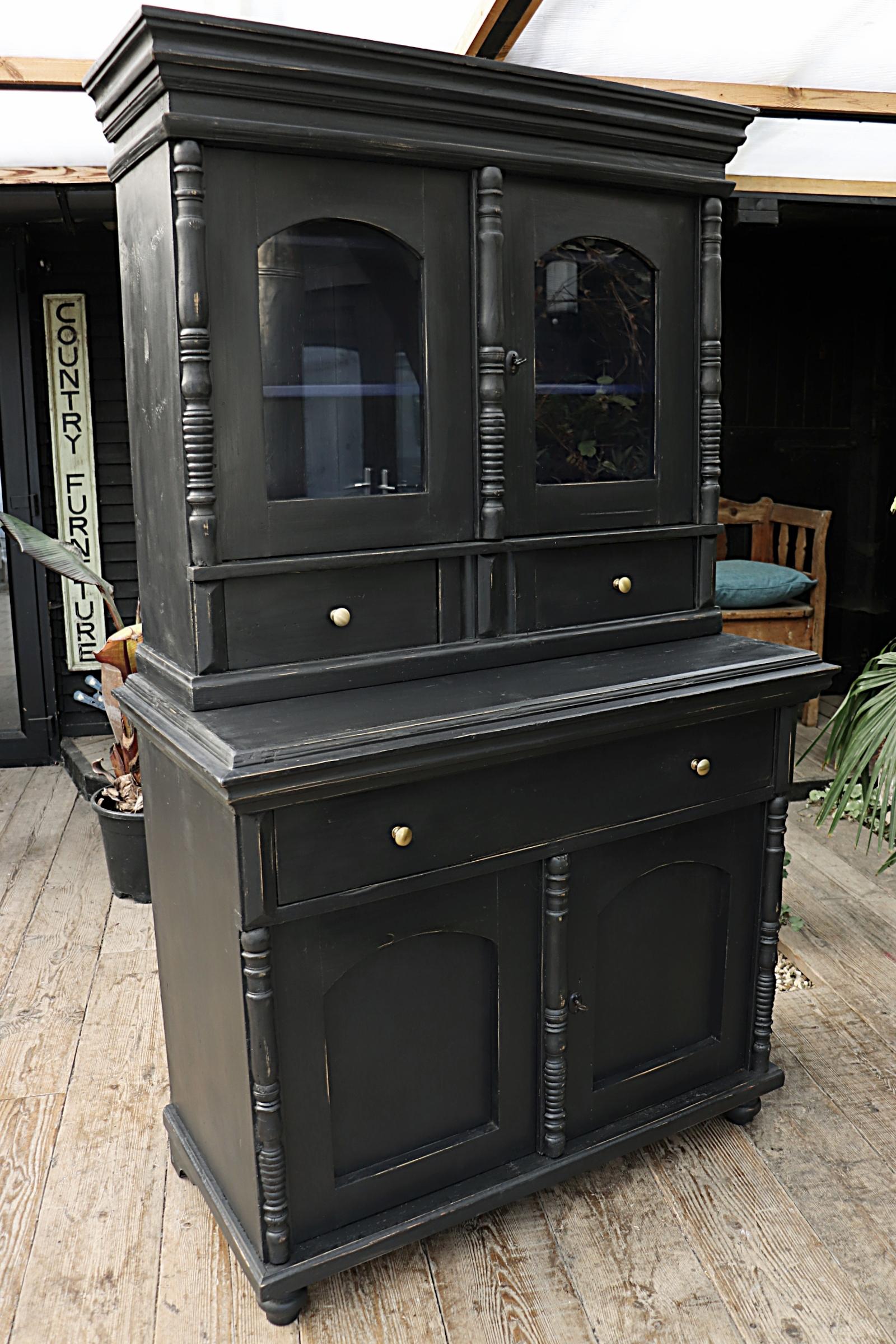 Beautiful Old Pine Black Painted Two Piece Glazed Dresser