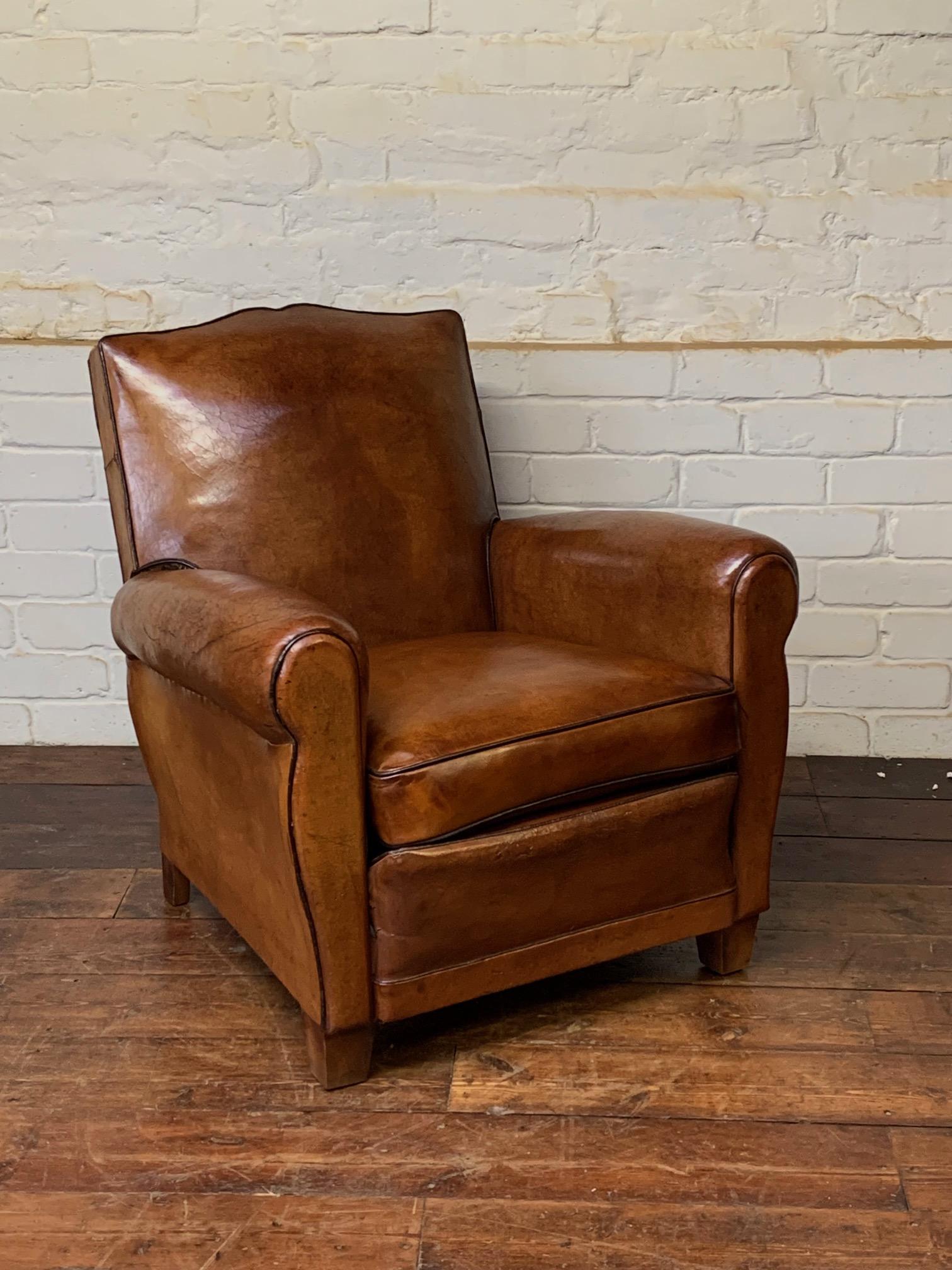 Beautiful & Original French Leather Club Chair Caramel Moustache Model c.1950