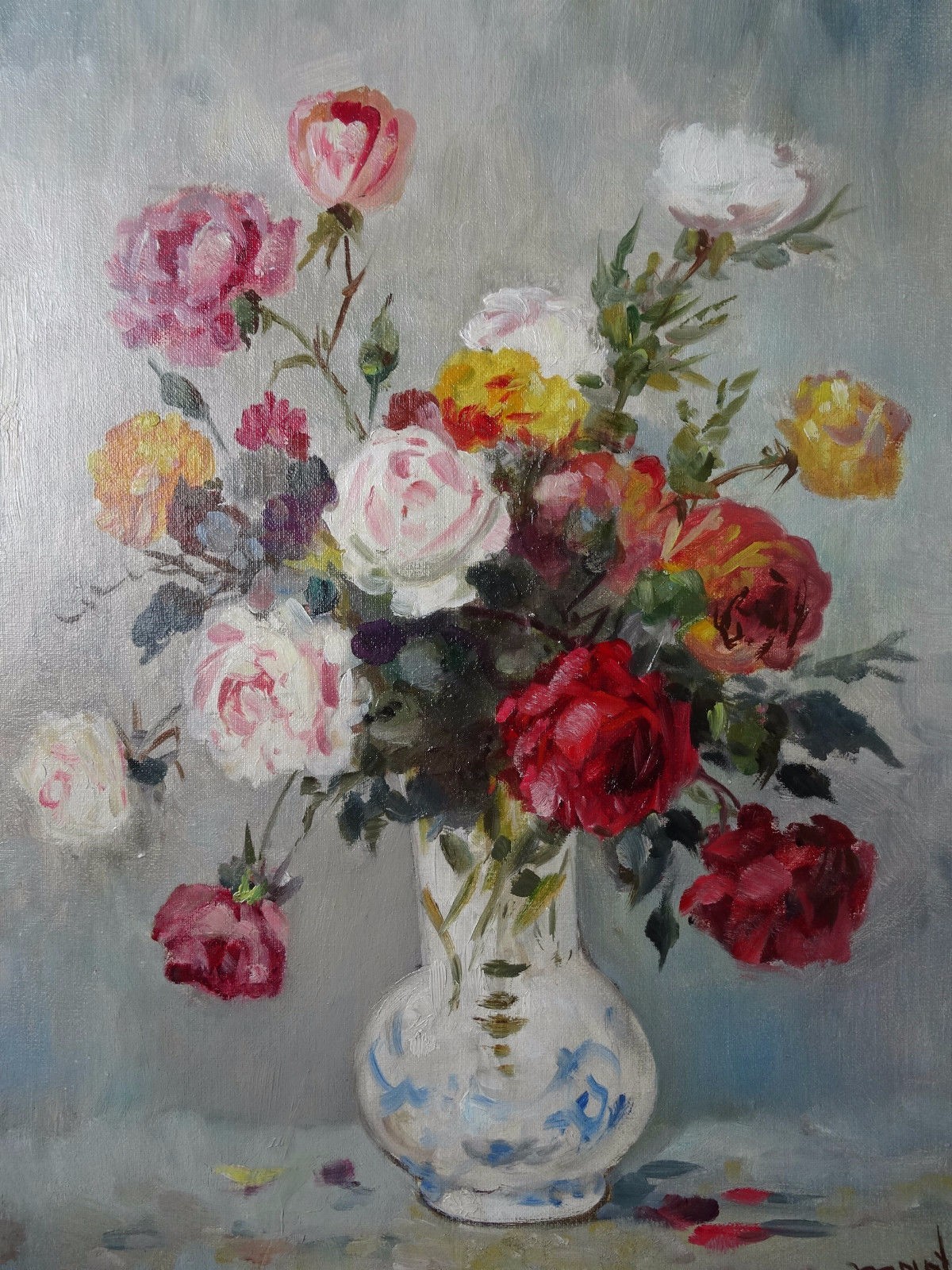 Beautiful Original Late 20th Century Floral Still-Life Sturdy Oil Painting - Signed