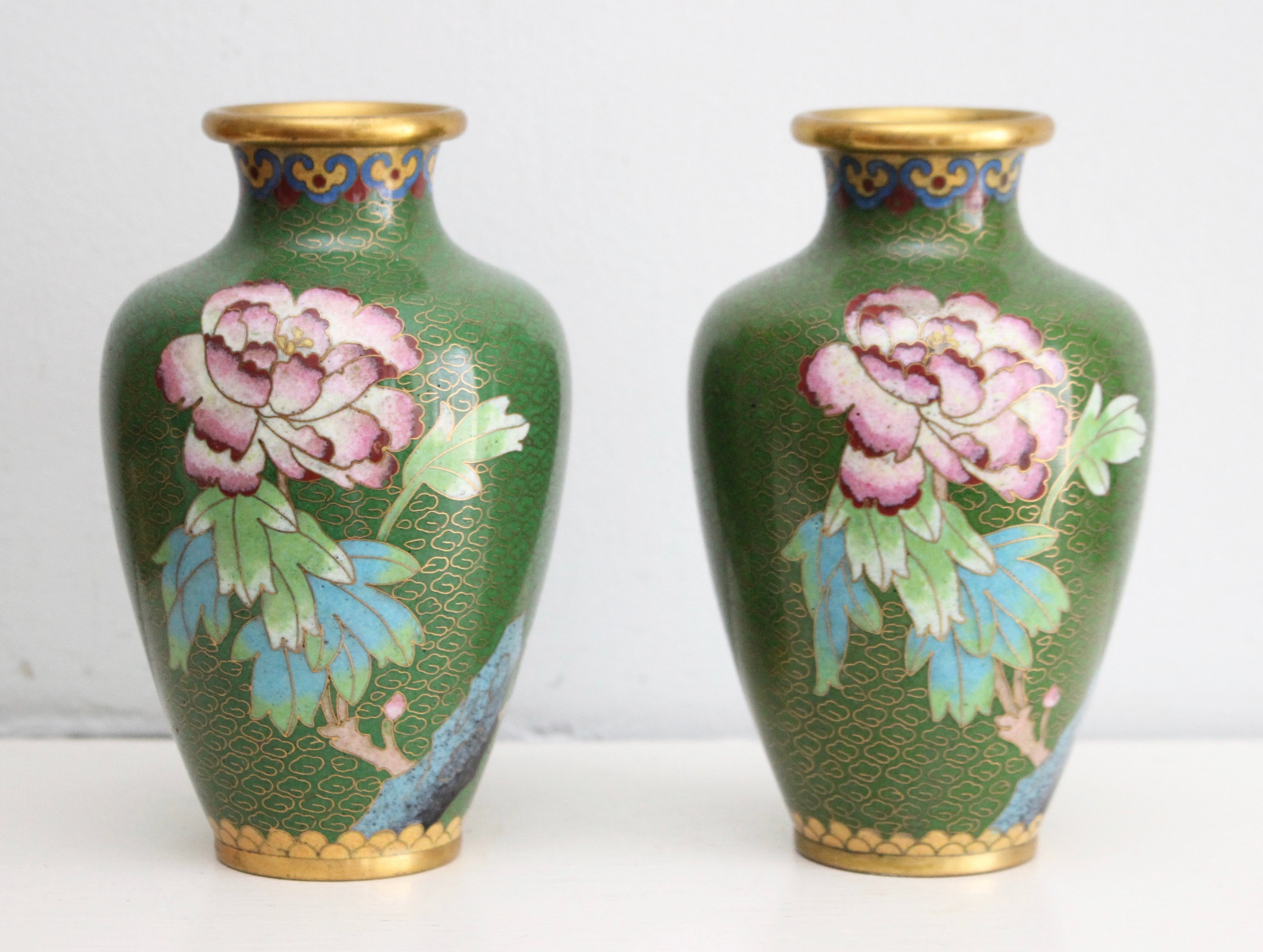 Beautiful Pair Antique Chinese Cloisonné Gilded Vases, Peonies On Green