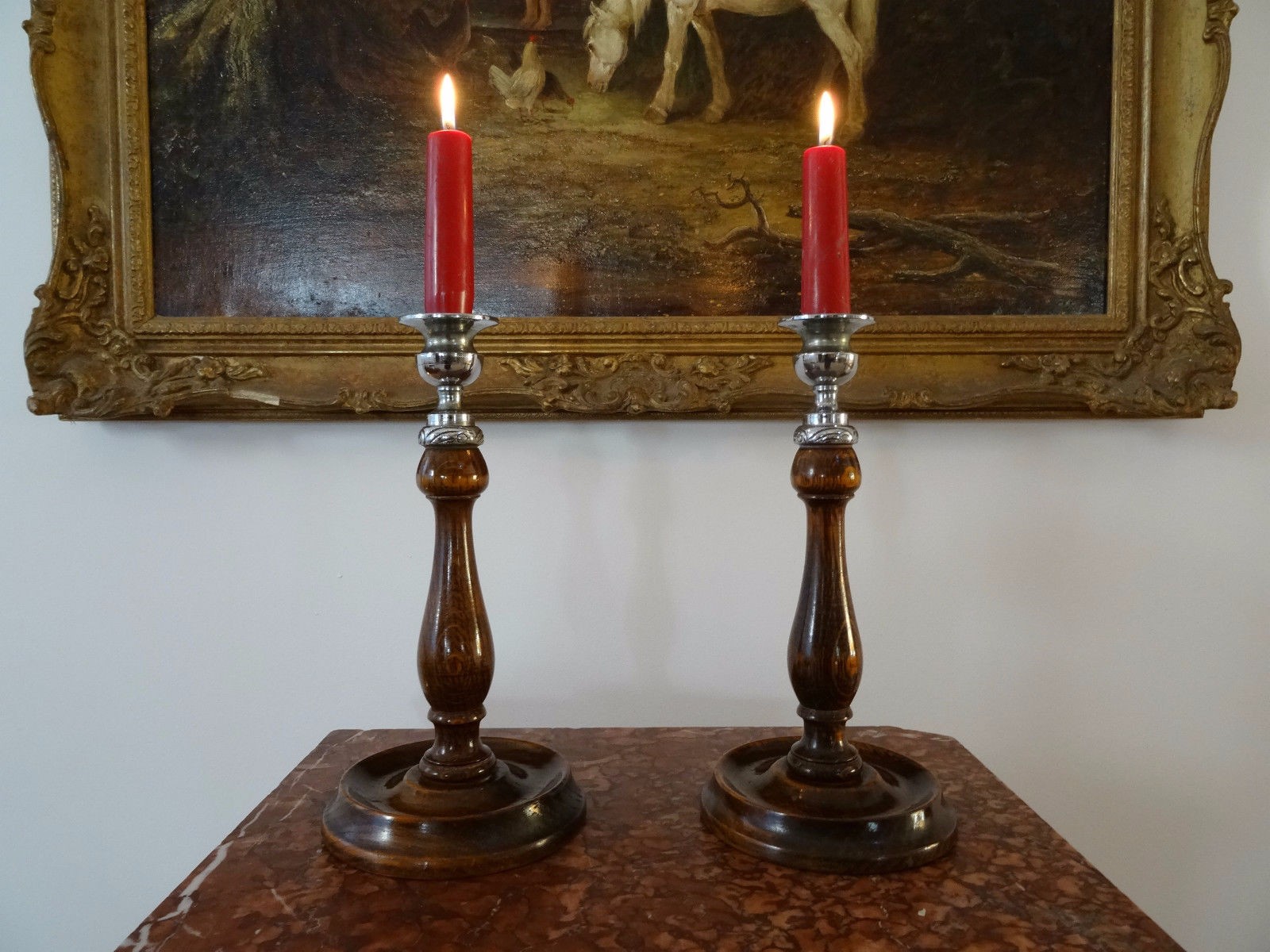 Beautiful Pair of Edwardian Oak & Silver Sconce Candlestick Holders - ENGLISH