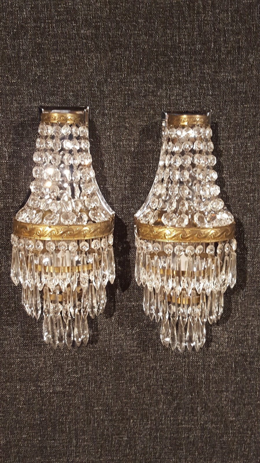 Beautiful Pair of Vintage French Brass & Chrome Empire Wall Lights with Drops