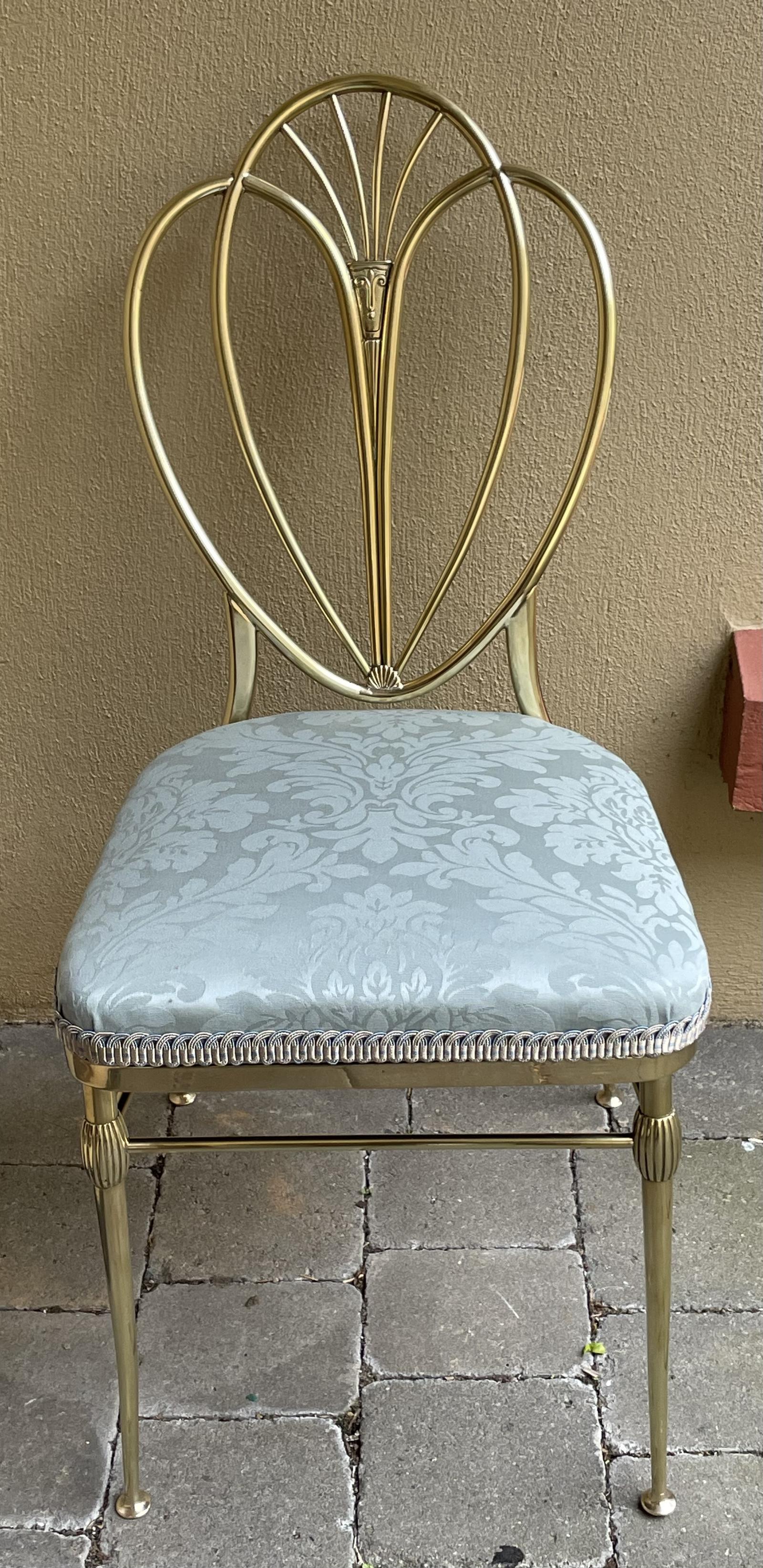 A fantastic vintage Italian salon chair in heavy brass, beautifully polished and seat recovered in quality Sanderson damask and finished in trim by Houles.