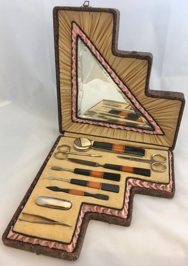 Beautiful Rare Art Deco Manicure Set with Original Fan Shaped Box & Original Bakelite Items