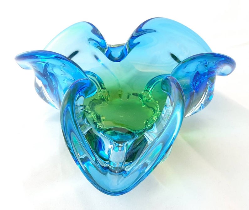 Beautiful Retro Chribska Glass Bowl, Freeform Blue & Green Glass