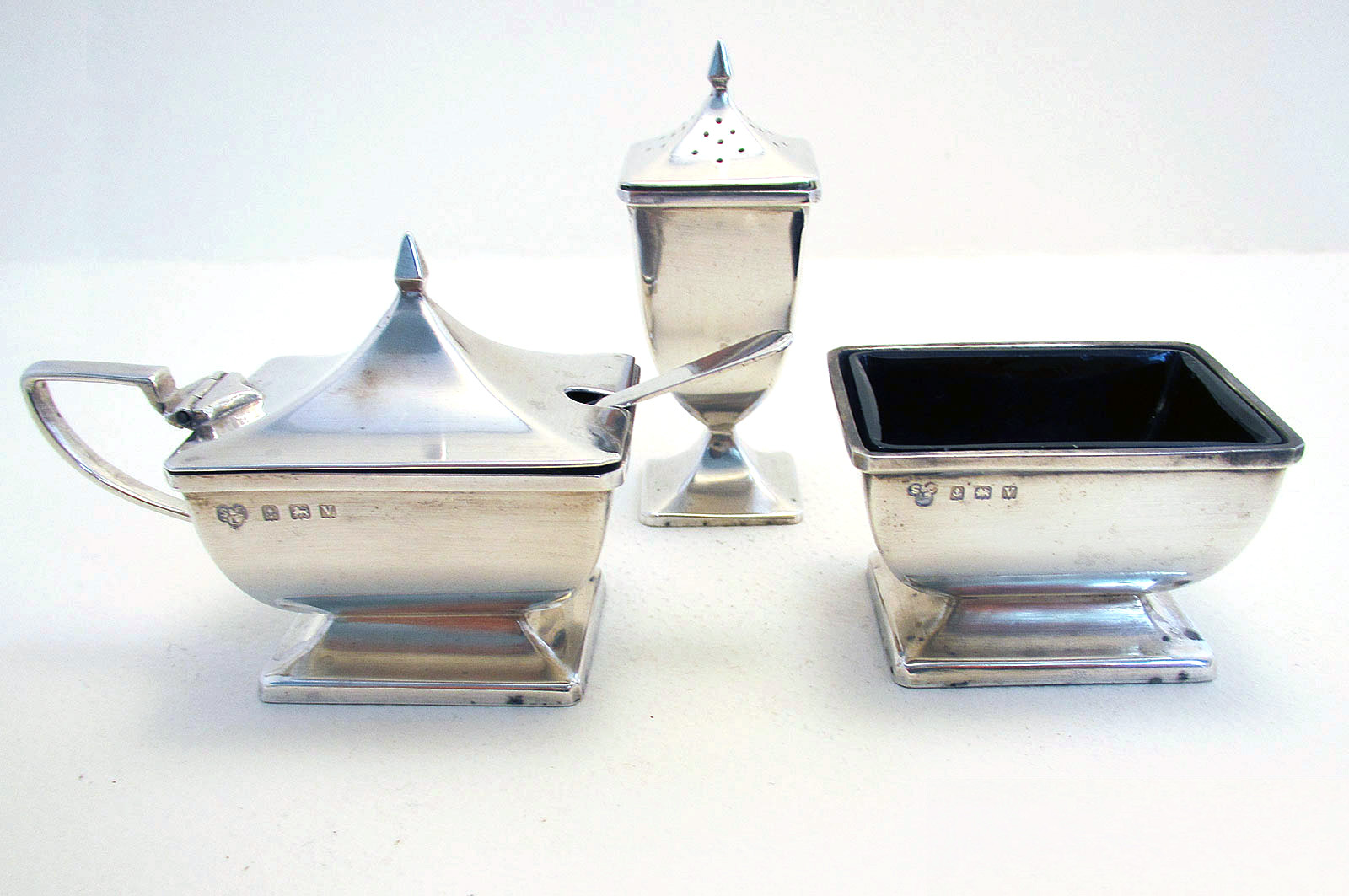 Beautiful Selfridges Three Piece Solid Sterling Silver Art Deco Cruet Set (Salt Cellar, Pepper Pot, Mustard Pot). Selfridge & Co C.1920 (1 of 1)