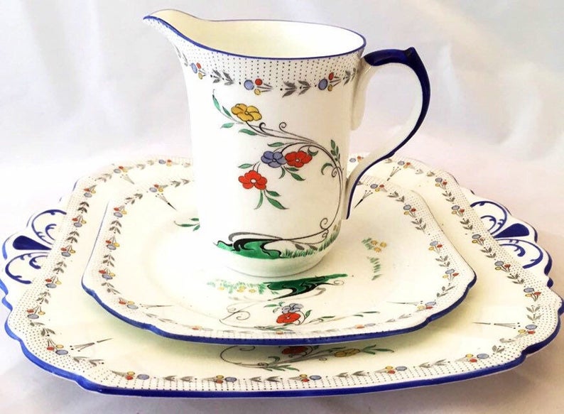 Beautiful Set of Three Shelley China Items, Jug, Plate & Cake Plate, Clarice Cliff Style Kitchen Decor, Gift for Her, Retro Kitchenalia