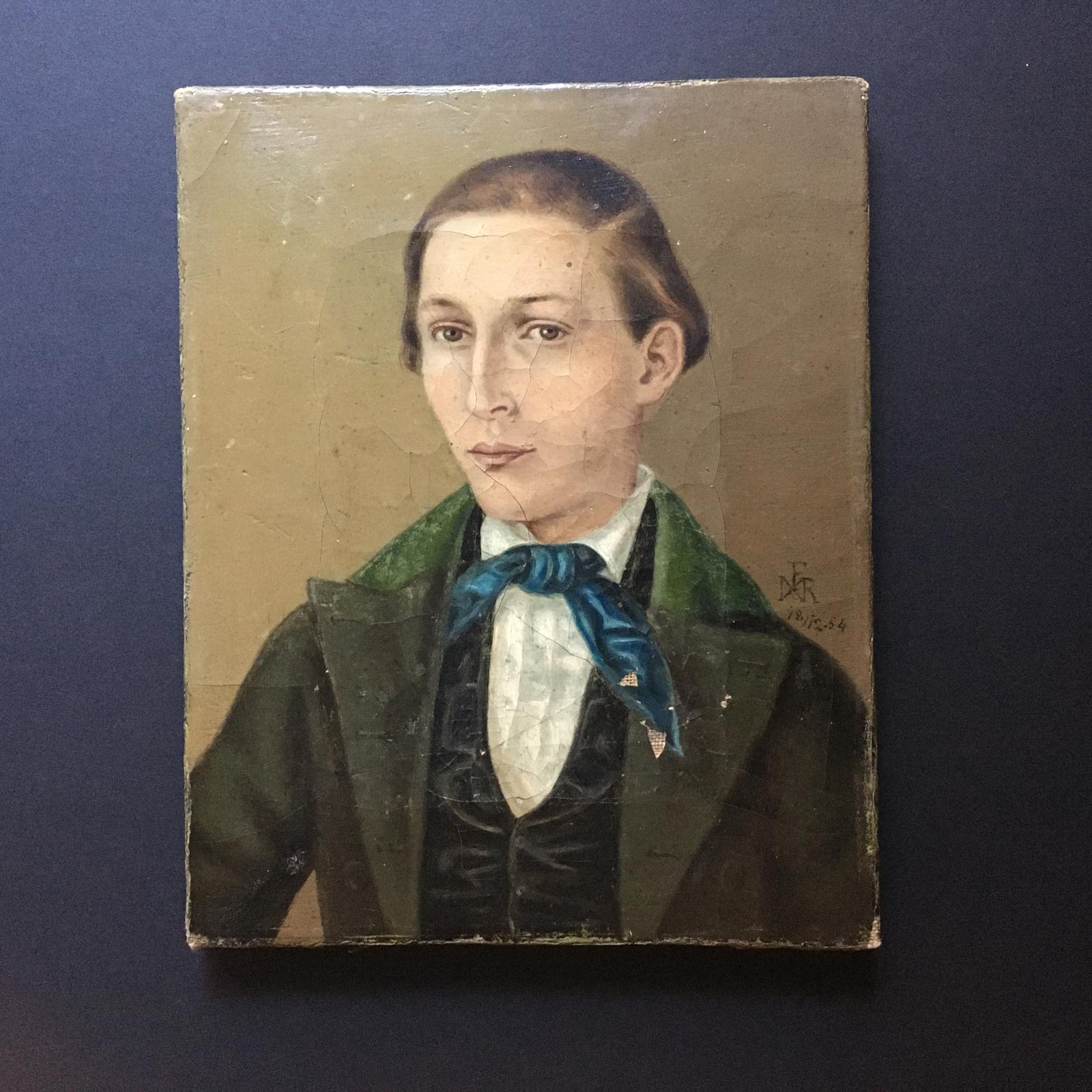 Beautiful Small Provincial Portrait of a Considered Young Gentleman with Green Coat and Blue Neck Monogrammed & Dated 1854
