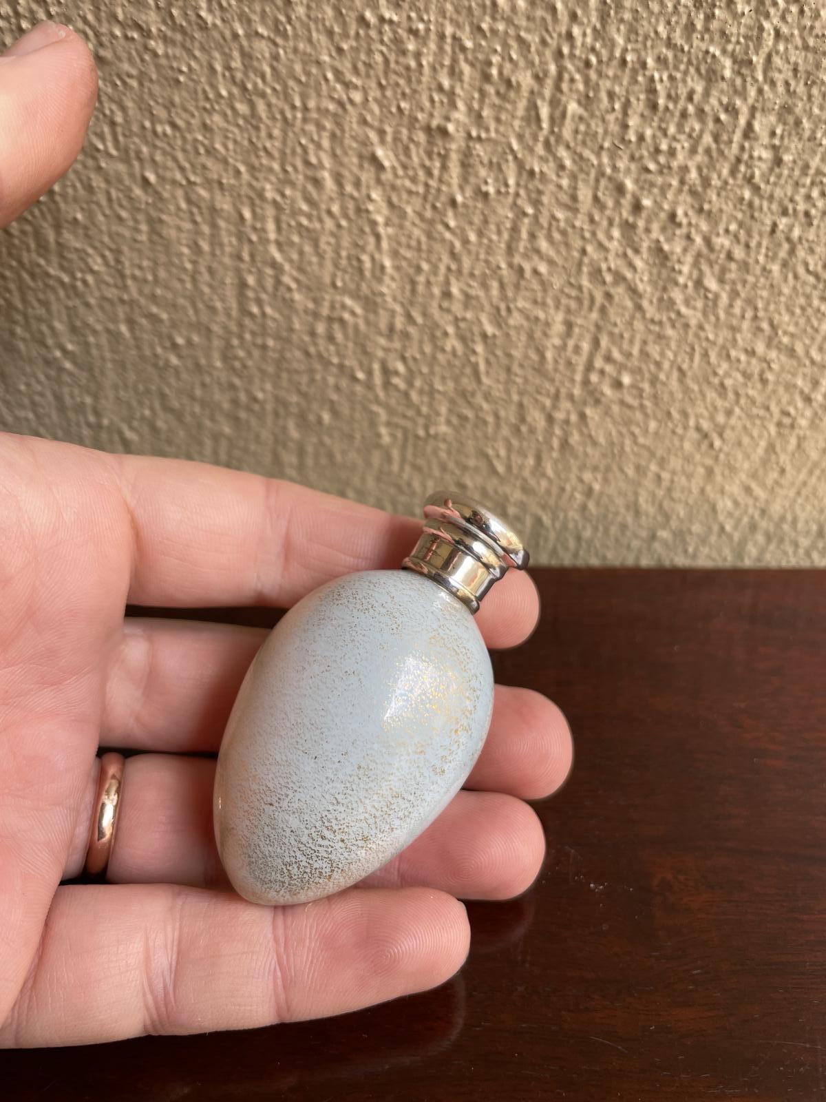 An exquisite Victorian solid silver topped blue and gold glass novelty scent bottle in the form of an egg; the silver cap fully hallmarked for London 1887 by maker TJ.
