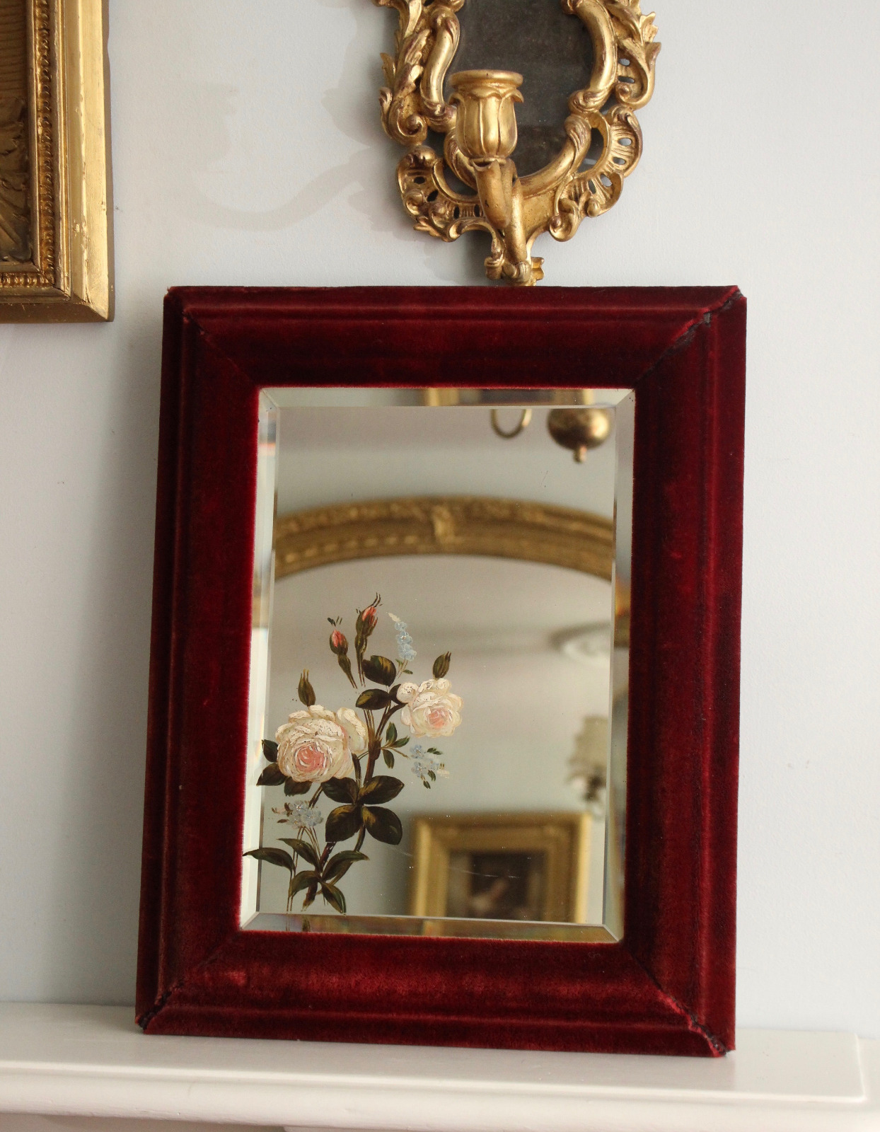 Beautiful Victorian Red Velvet Bevelled Mirror, Hand Painted Floral Bouquet