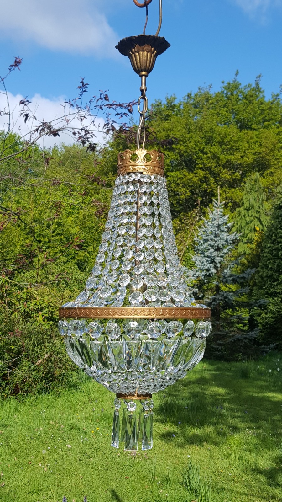Beautiful Vintage French 1950s Brass Empire Chandelier with Glass Drops