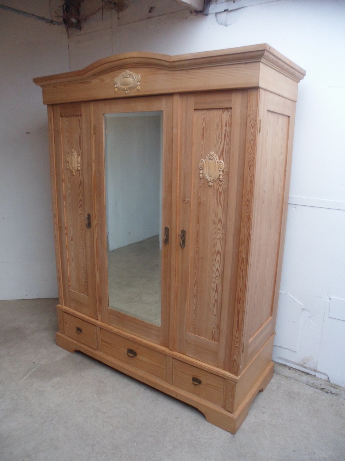 Beautifully Waxed Triple Old Pine 3 Door Mirrored Knockdown Wardrobe
