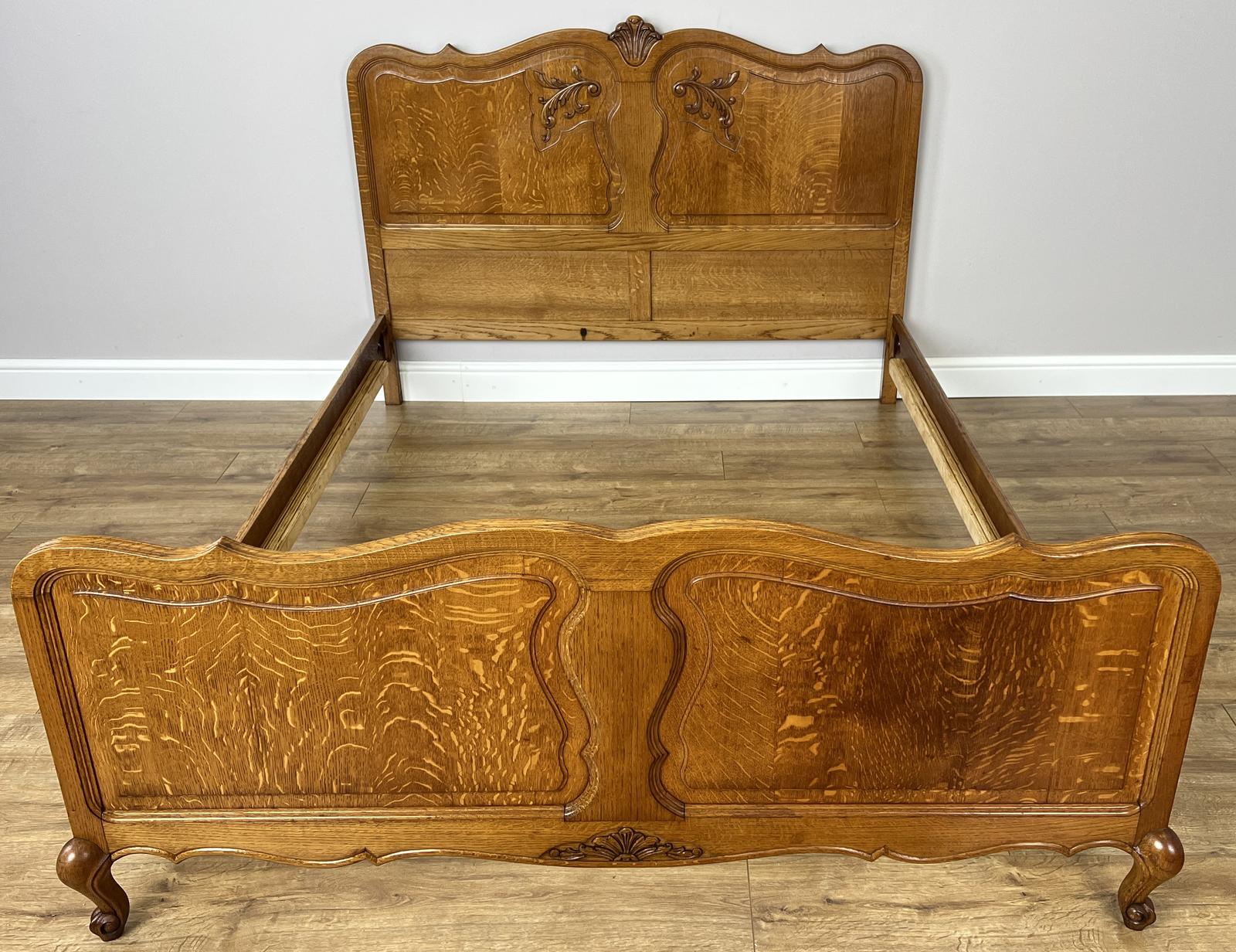 Made from oak, the bed features a striking shaped headboard with delicate carved detailing and a matching footboard with graceful curves. The natural wood grain is particularly eye-catching, giving the piece depth and character. Raised on cabriole-style legs, the frame reflects authentic French Louis styling, blending elegance with sturdy construction.