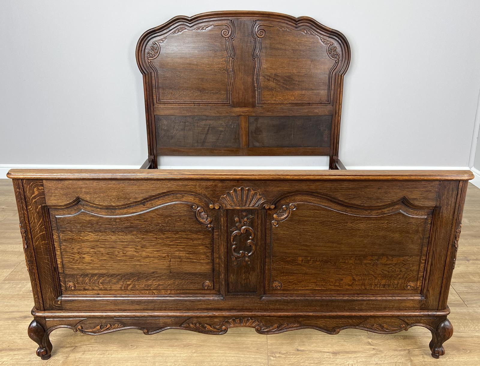Crafted from oak, this piece features a tall, shapely headboard with refined carved accents and a decorative footboard with a central motif. The curved lines, cabriole-style feet, and warm finish highlight the timeless appeal of French Louis furniture.