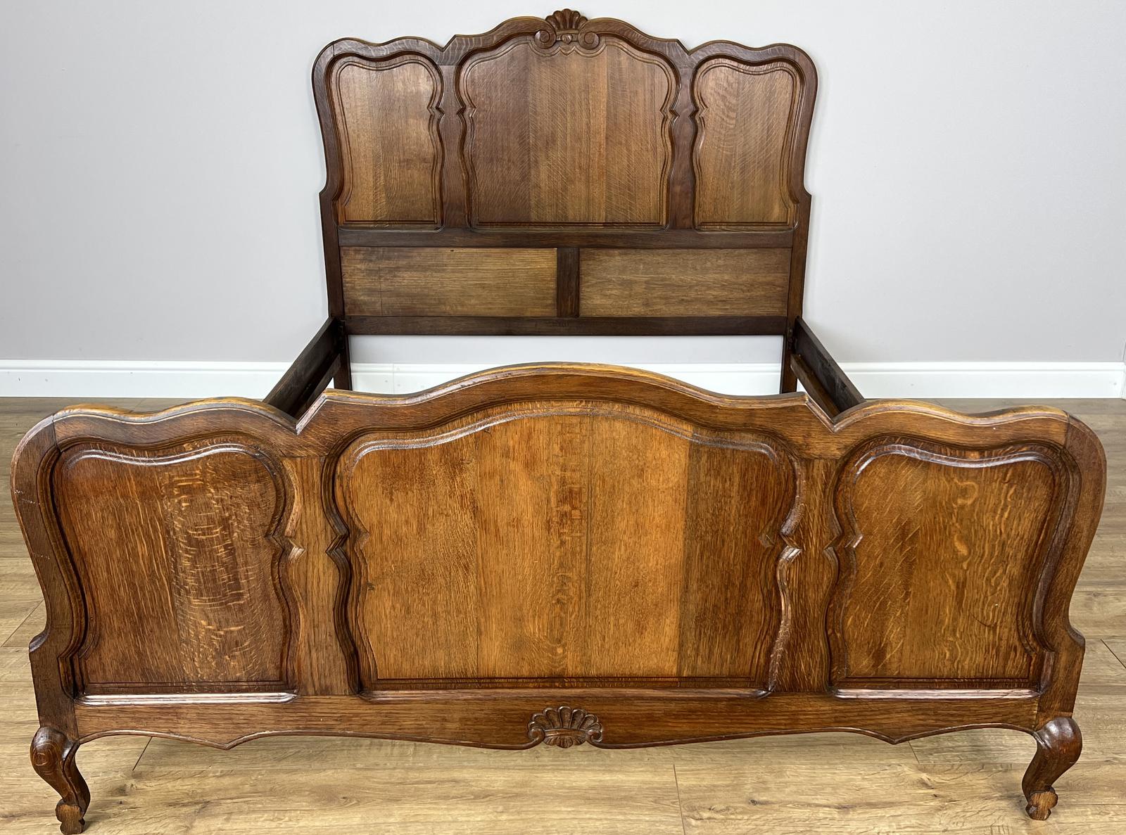 Crafted from oak, this bed frame features classic French Louis styling with softly shaped panels, flowing lines, and decorative carved accents. The cabriole-style legs and gently contoured headboard and footboard give it a refined and elegant presence, perfect for traditional interiors.