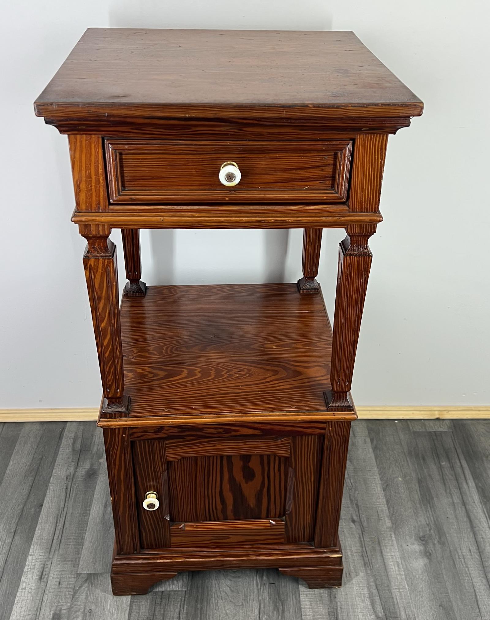 Crafted with a warm, deep-toned wood finish, this bedside cabinet highlights striking natural grain patterns throughout. The structure is enhanced by elegant carved legs and refined panel detailing, while the classic drawer and cupboard combination adds both function and balance to the design. Subtle decorative carving and traditional shaping give it a distinctive antique French presence.