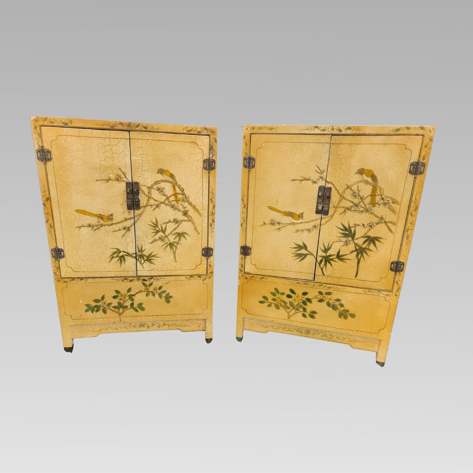 Vintage Oriental Chinese Yellow Ground Chinoiserie Style Pair of Bedside Tables / Low Storage Cupboards