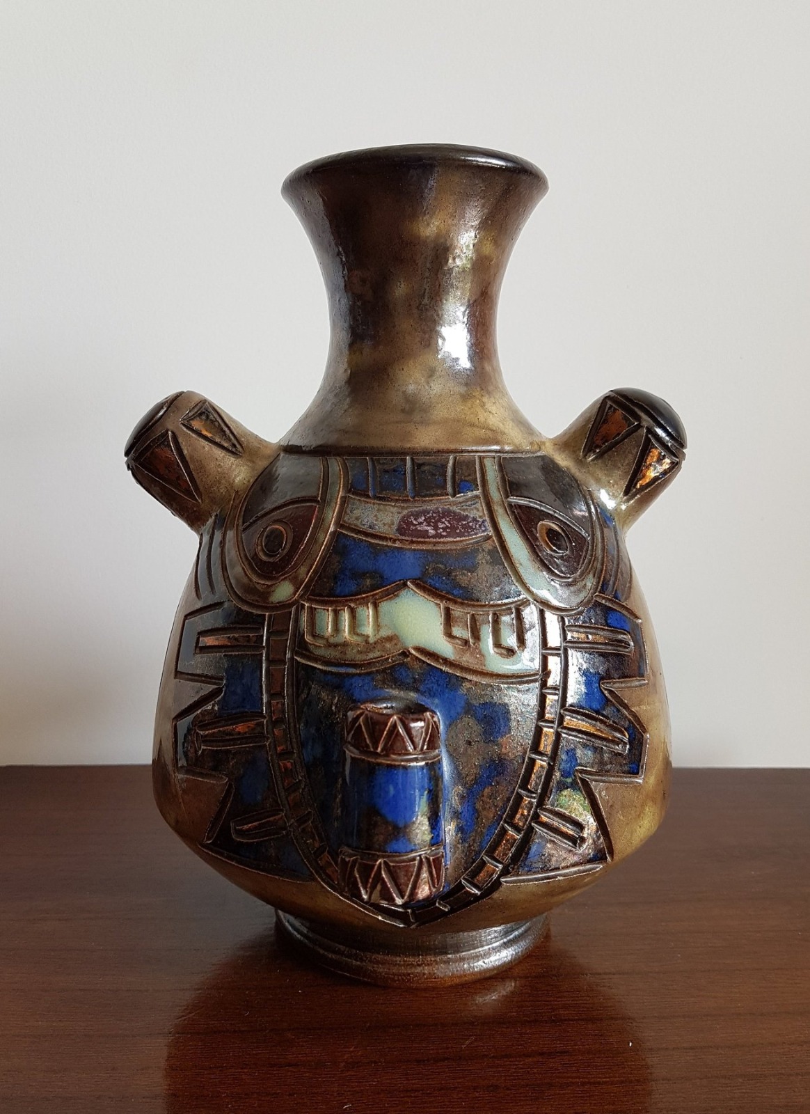 Belgian Roger Guerin, Exceptional Double-Sided Decor Stoneware Vase - Signed