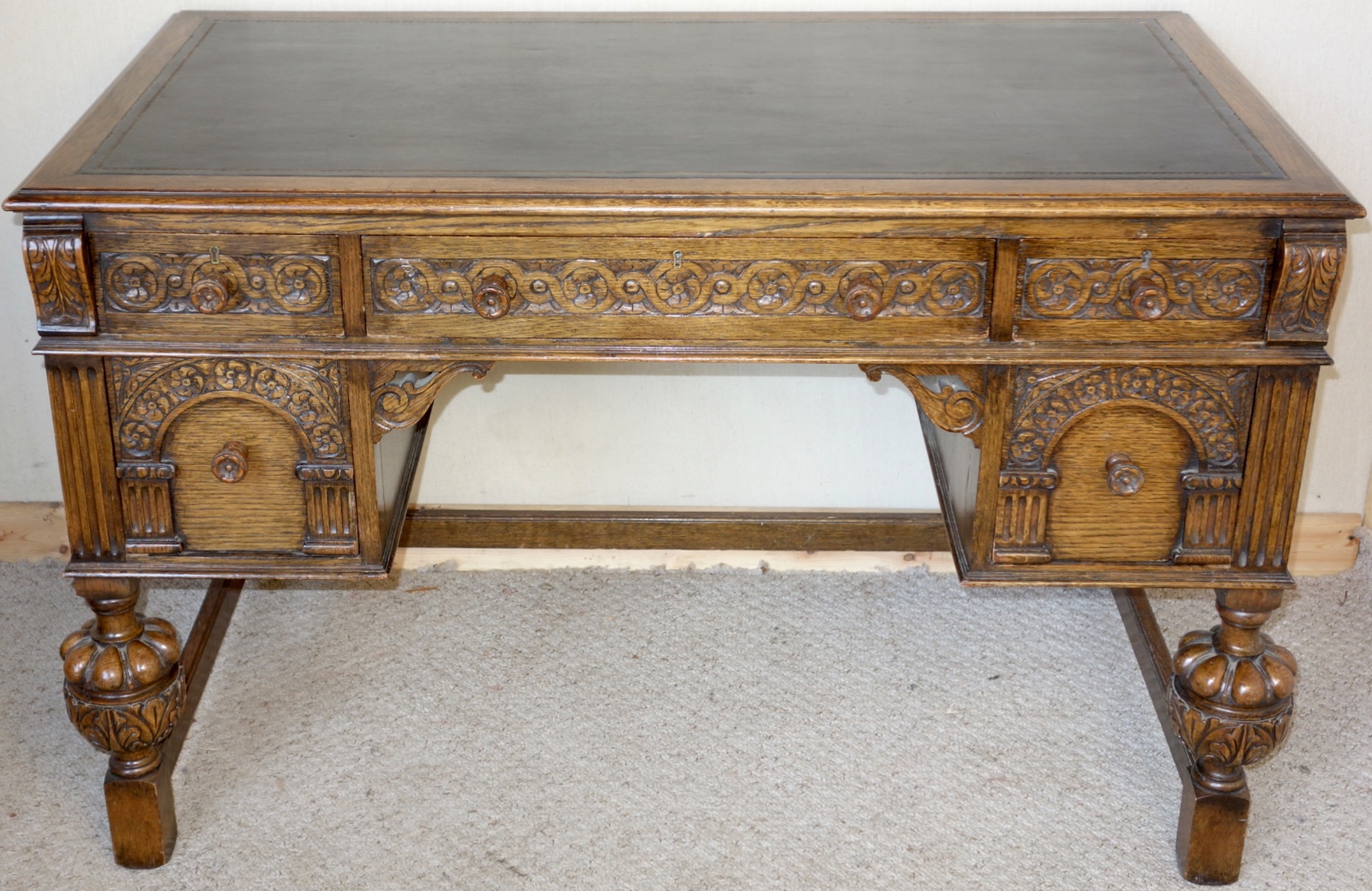 Beresford & Hicks Carved Oak Leather Writing Desk c.1930 (1 of 1)