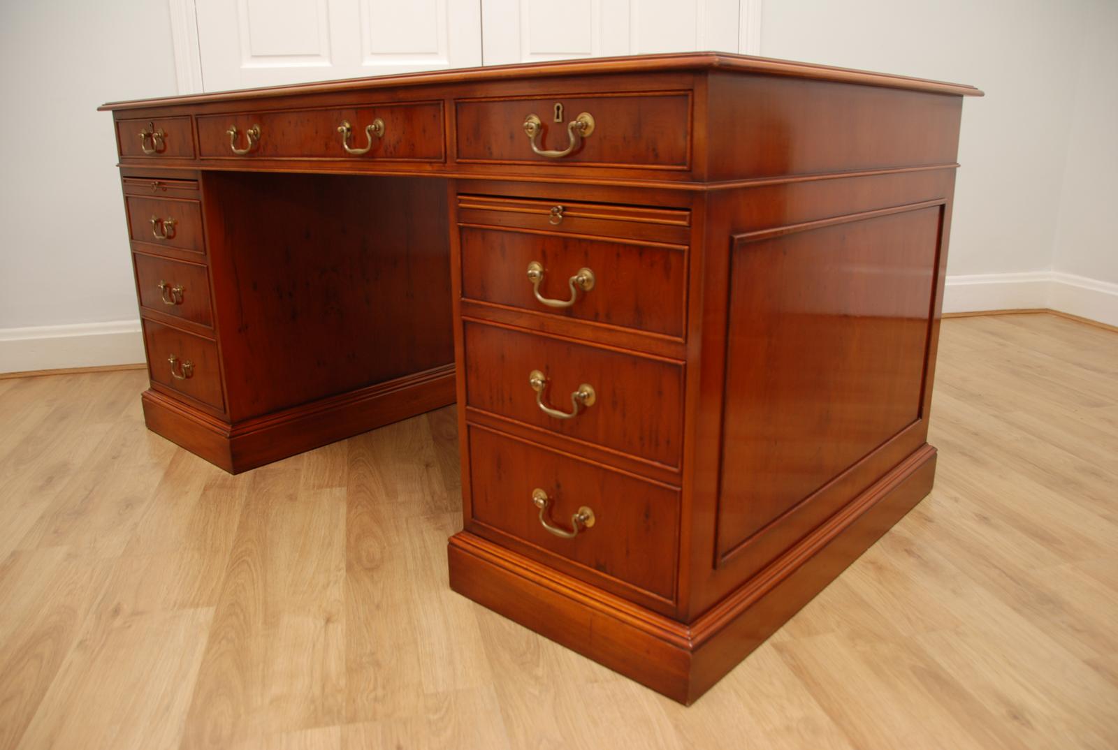 Bevan Funnell Partners Twin Pedestal Yew Desk Burgundy Leather