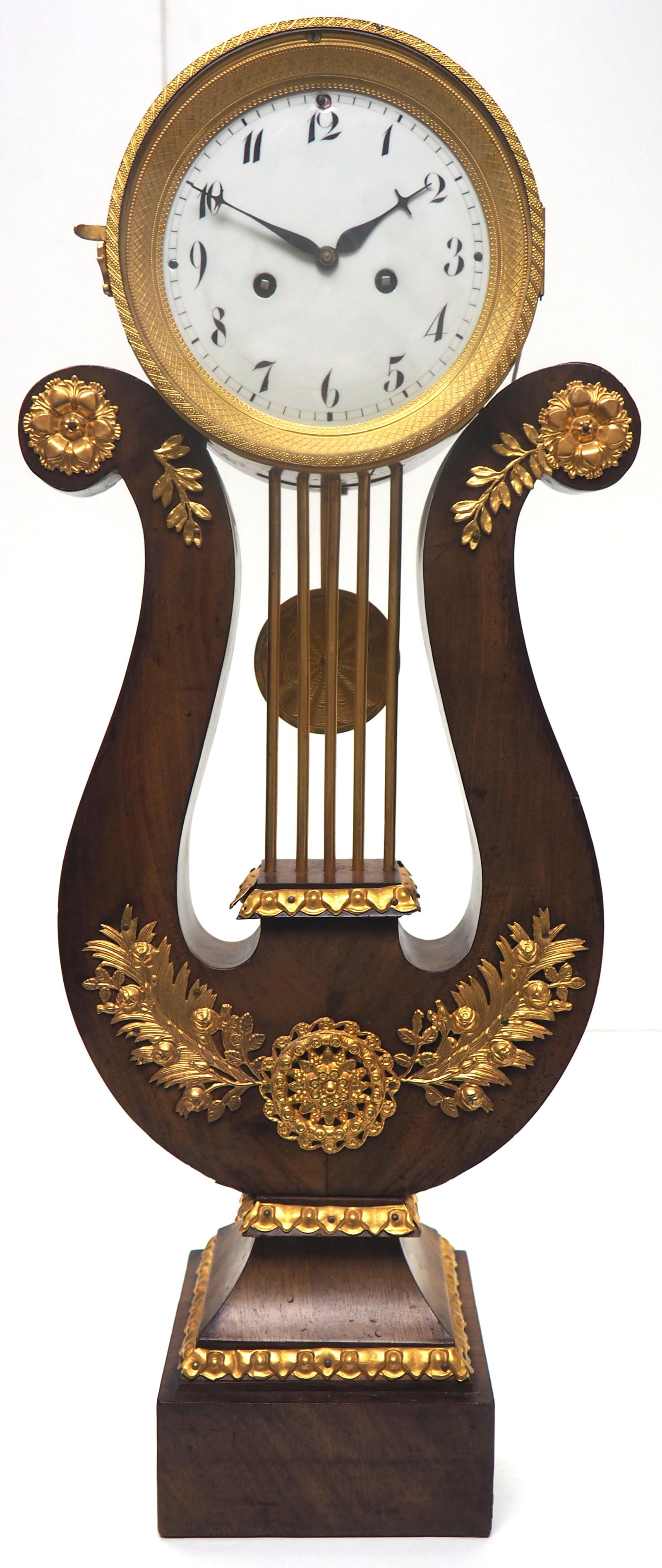 Biedermeier Walnut Mantel Clock – Lyre 8 Day Striking Mantel Clock With Visible Pendulum c.1820