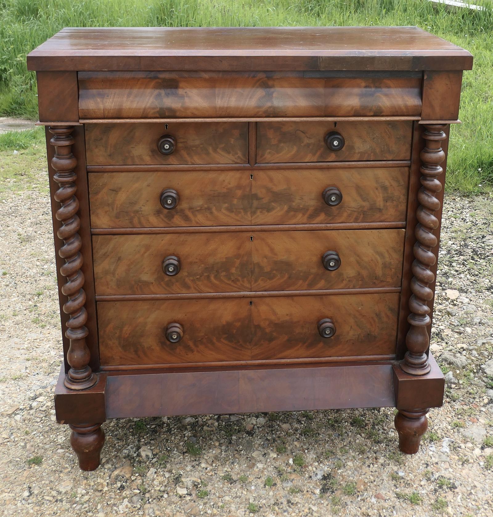 The chest is heavy quality and has well figured flame mahogany veneers with large barley twist pillars on either side and it has an attractively shaped top with a secret drawer. The chest has a secret drawer, over 2 short and 3 long graduated drawers, the chest stands on turned feet, it has the original turned wooden handles.