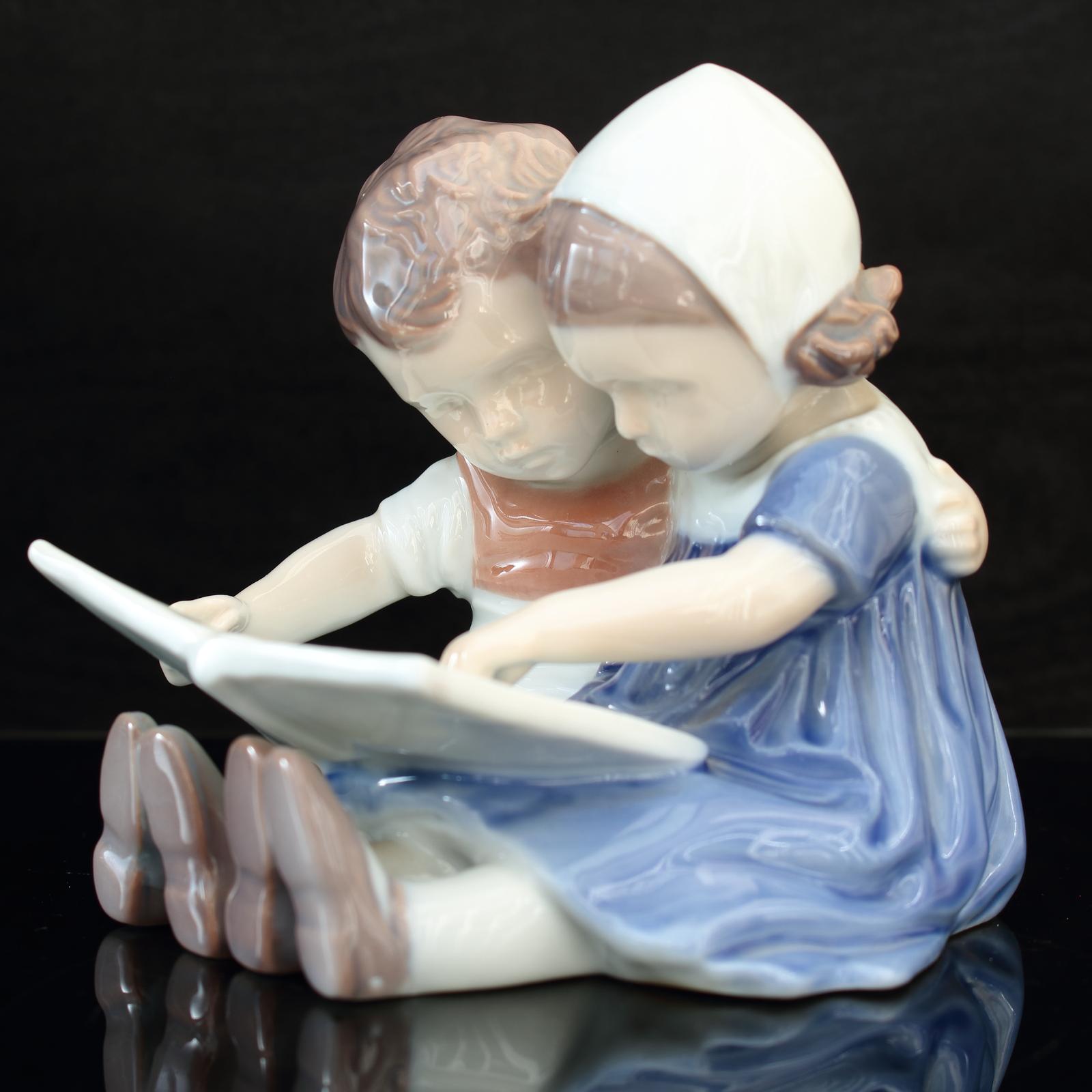 Wonderful Bing & Grondahl porcelain figure group depicting two children reading a book, model number 1567 by Ingeborg Plockross Irminger, made mid-20th century in Copenhagen, Denmark.