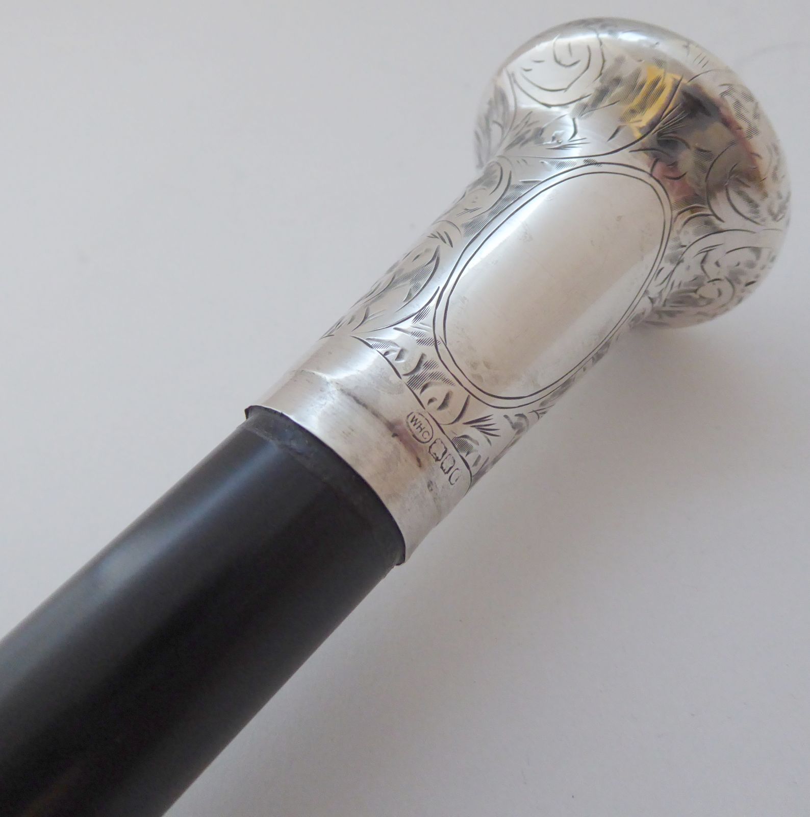 Birmingham 1927 Walking Stick Cane Hallmarked Solid Silver Pommel Ebony Wood Shaft