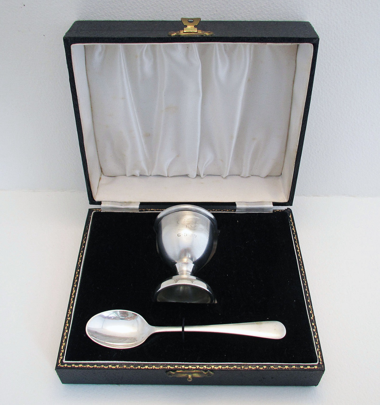 Birmingham Hallmarked Solid Sterling Silver Egg Cup Cruet & Spoon with Box, Cased 1958 (1 of 1)
