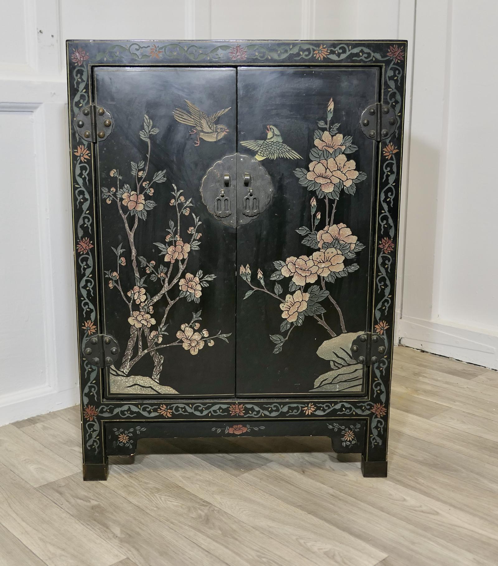 Black Chinoiserie Lacquer Cupboard Decorated with Birds & Flowers