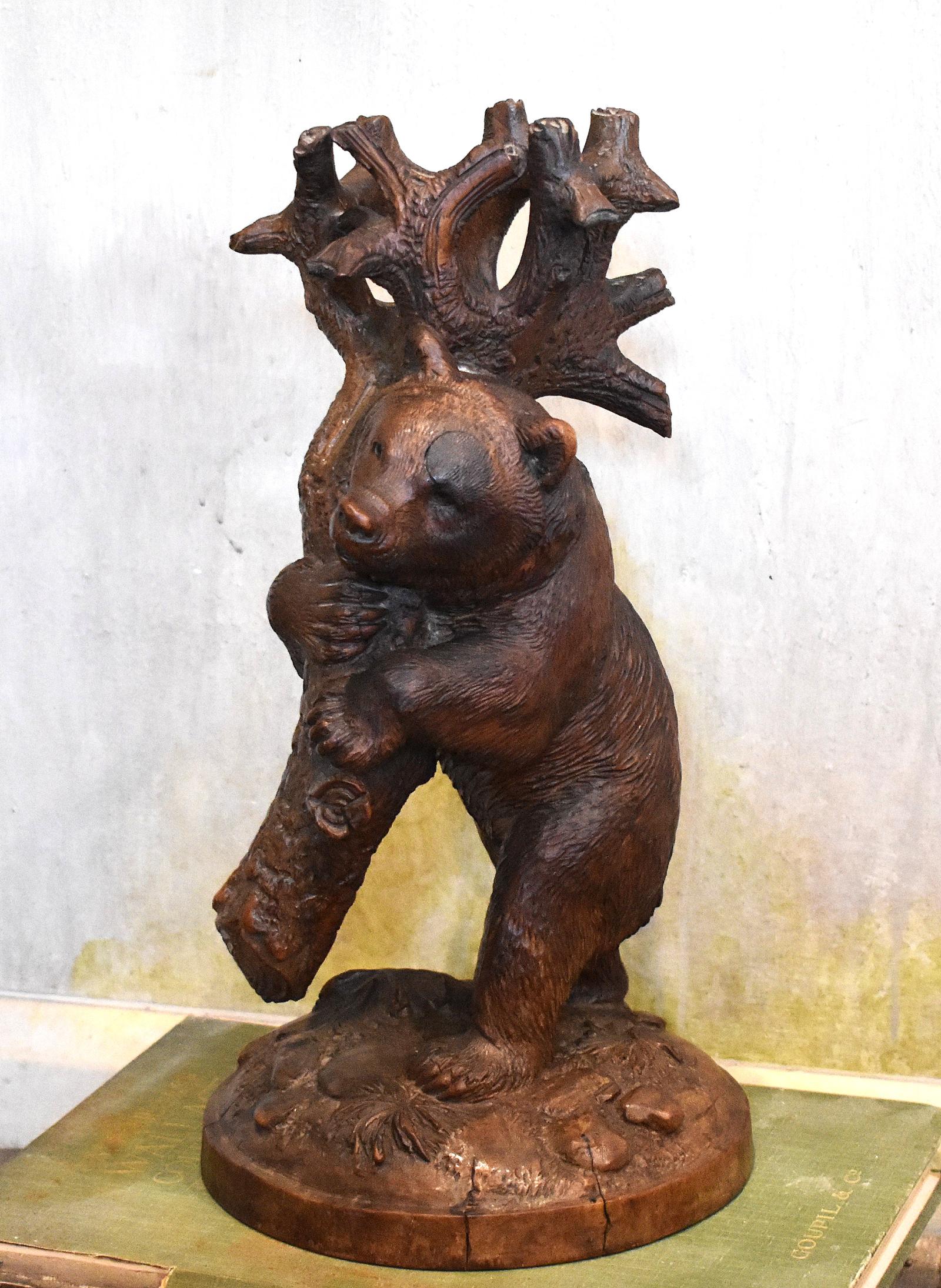 A fine example of a Black Forest bear carving. The piece is carved in Linden wood to a really high standard and depicts the bear rising on its back legs and carrying an upturned tree stump. The roots of the stump would have been a receptacle for something, perhaps a decanted or comport etc. The piece is in good condition; there has been an old repair around one eye and minor pieces to the tree stump. The whole has a great colour and is a nice early example of these bear carvings with glass eyes. C.1880.