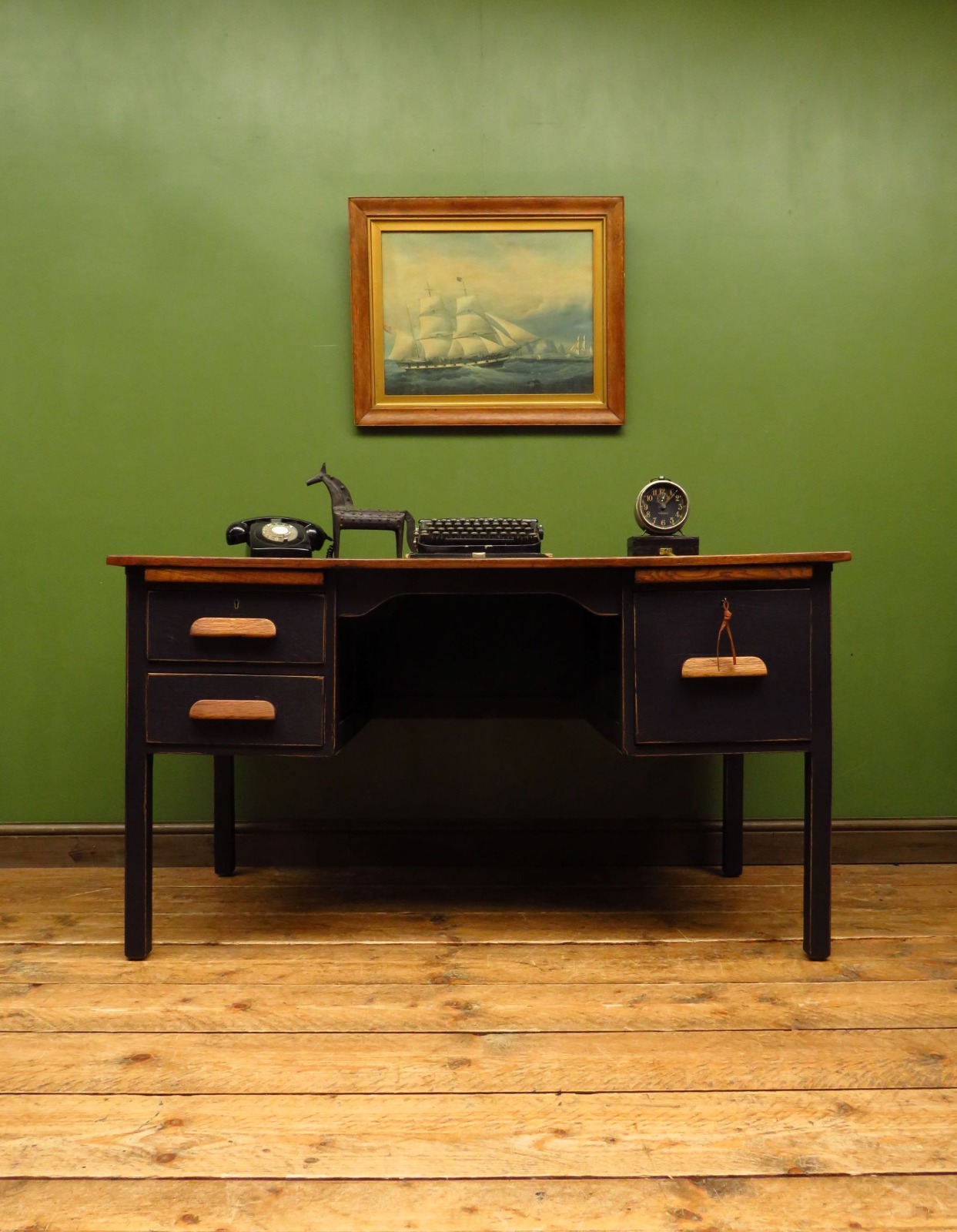 Black Painted Oak Desk, Mid Century Ministry of Defence Type Desk, Stripped Top