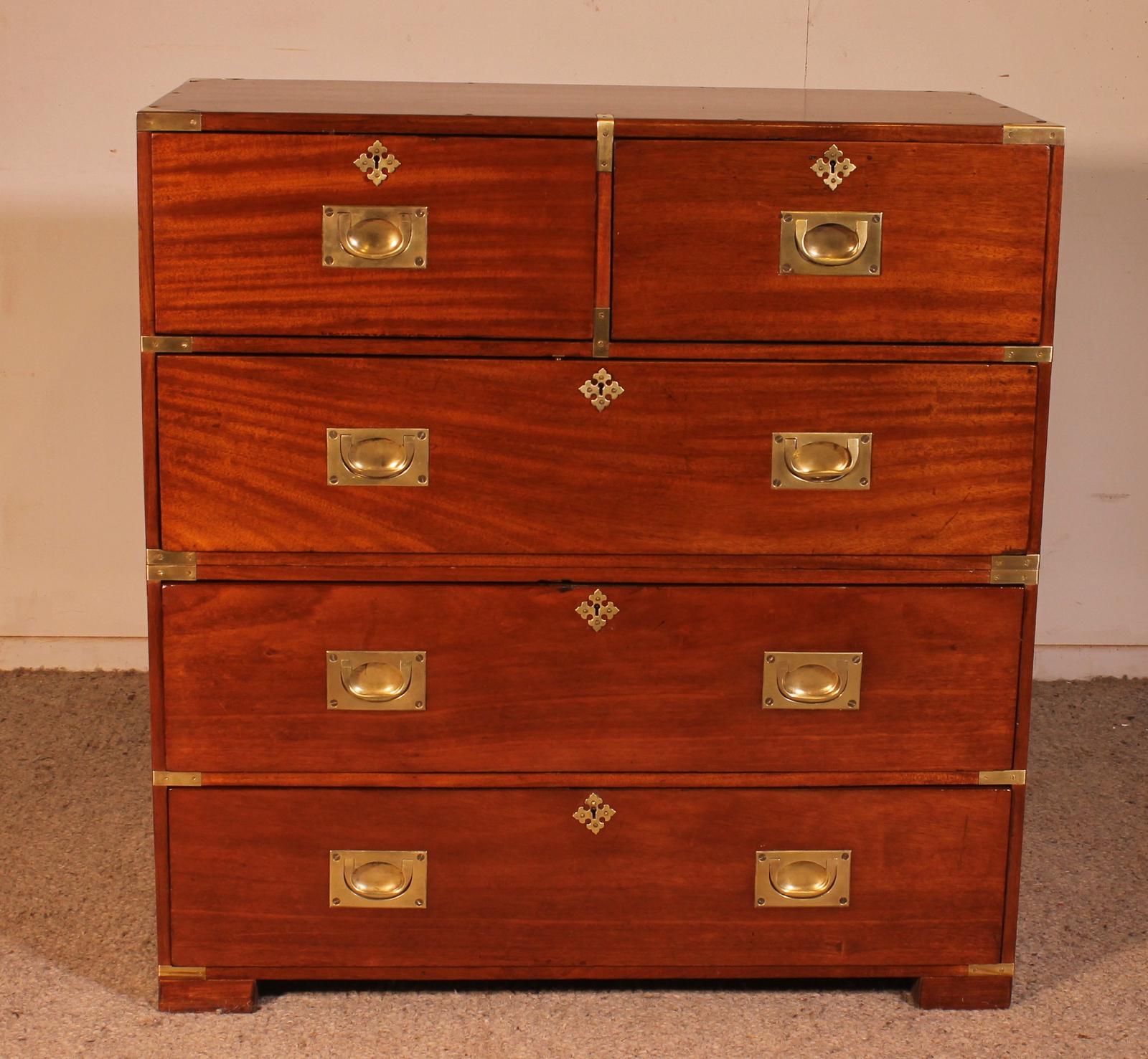 The chest is made entirely of solid mahogany and features the square shape typical of military chests of drawers. Very beautiful and unusual blond mahogany with a superb flame dovetailed drawers. A sign of quality.