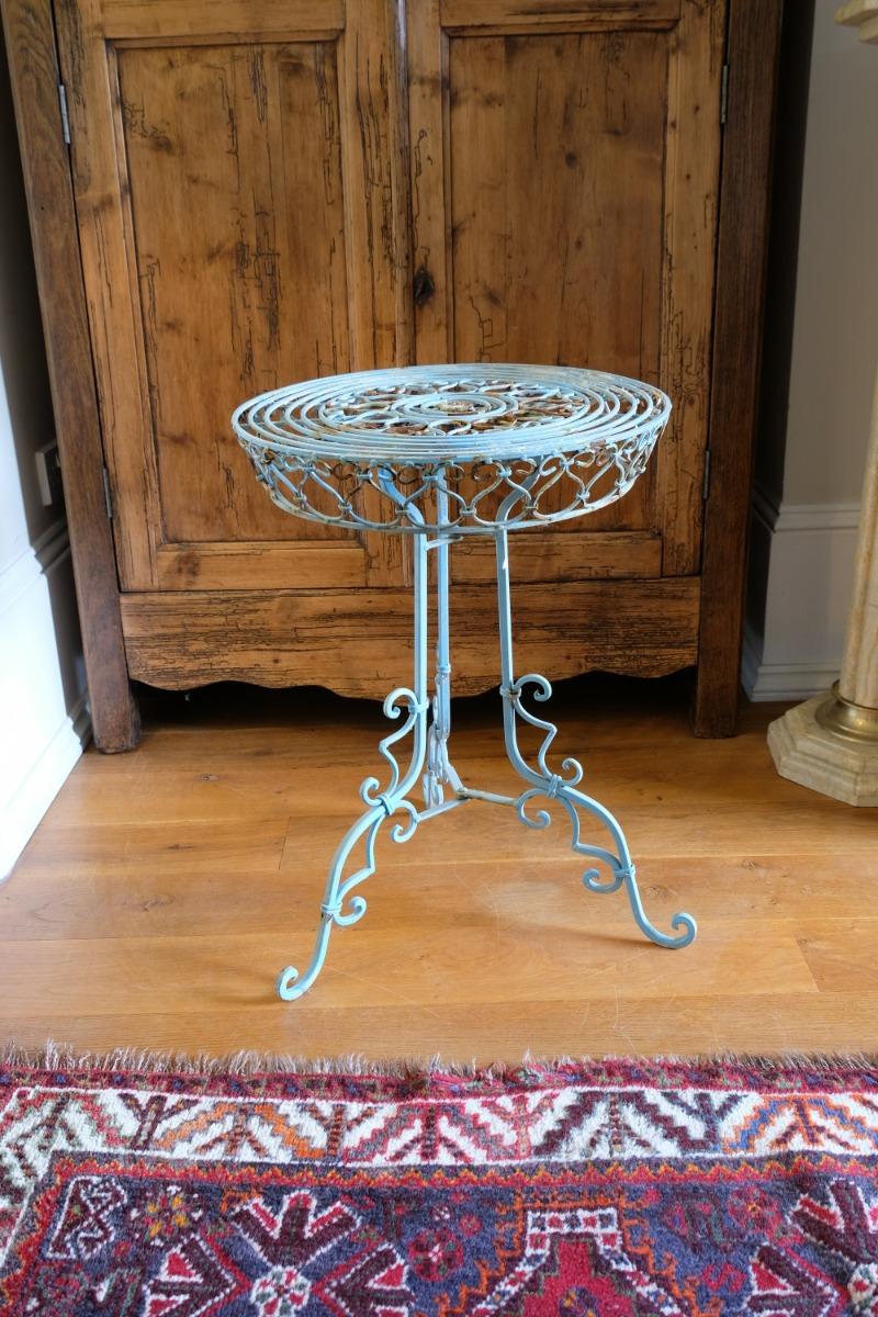 Blue Green Painted Wrought Iron Circular Garden Tripod Table