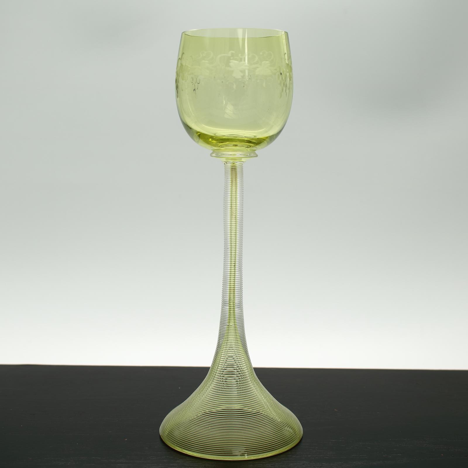 Wonderful quality drinking glass from the Art Nouveau period with hand engraved vine decorations to bowl, and a thin tall hollow ribbed stem that flares out at the base. An exquisite and rare drinking glass that is guaranteed to impress and be a great addition to any glass collection.