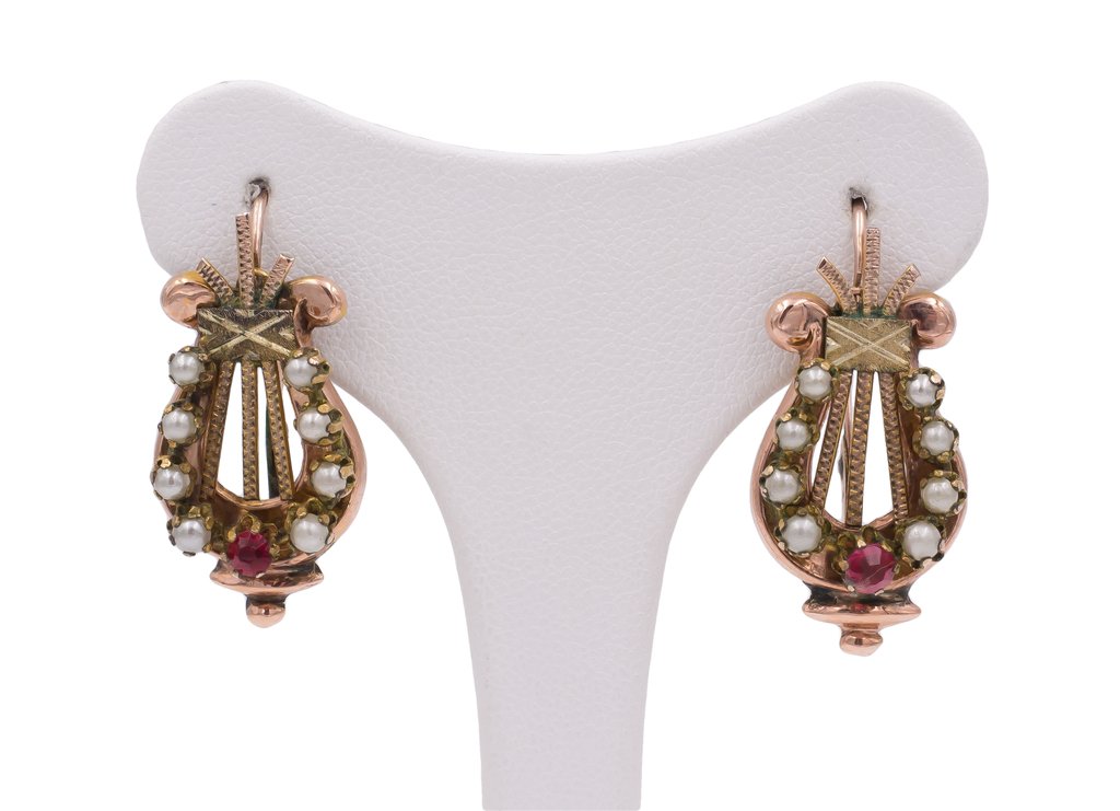 Bourbon Gold, Bead & Red Stone Earrings, 2Nd Half of 19th Century