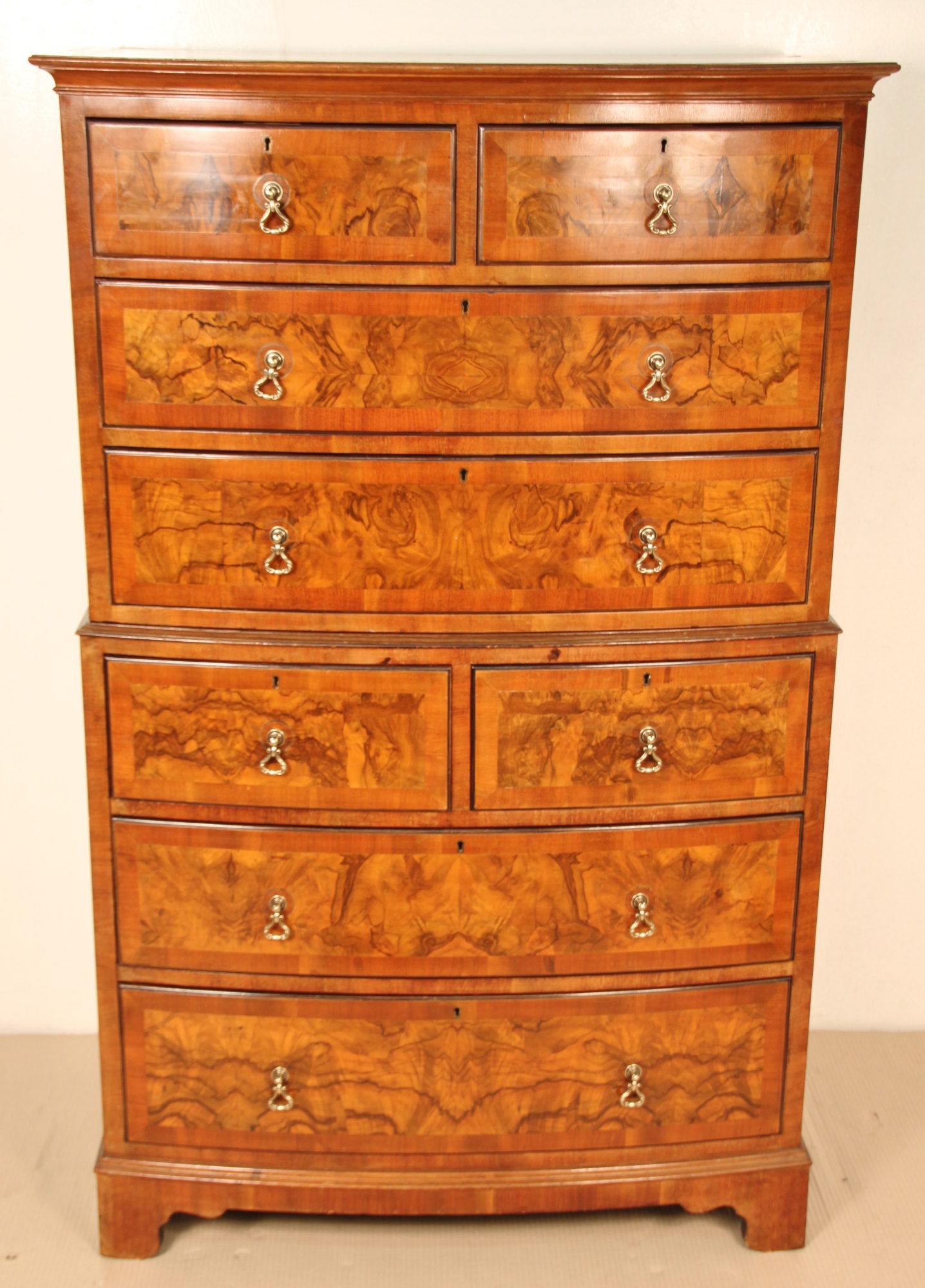 Bow Fronted Burr Walnut Chest on Chest c.1920