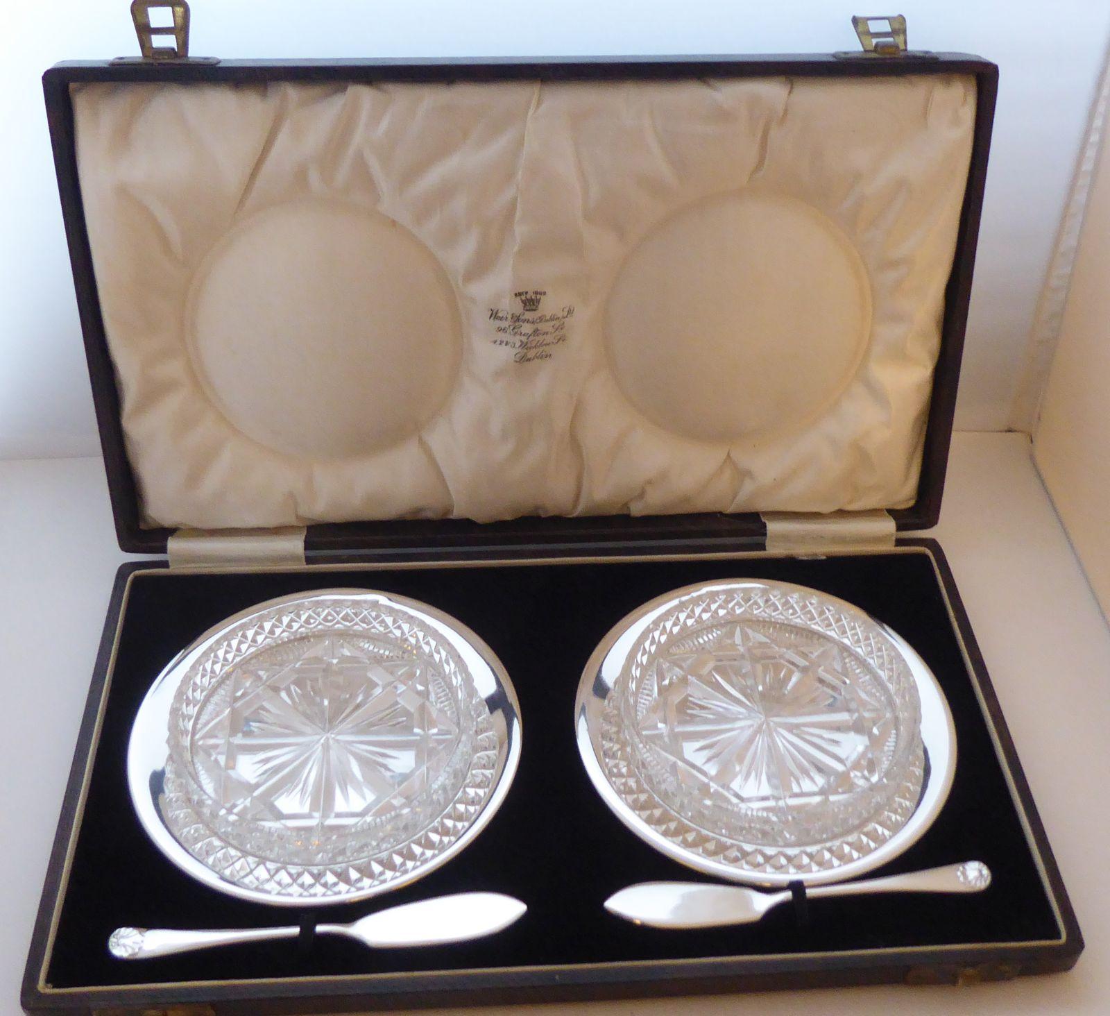 Boxed Pair of 1933 Irish Solid Silver Butter Dish Dishes Knives Knife Set
