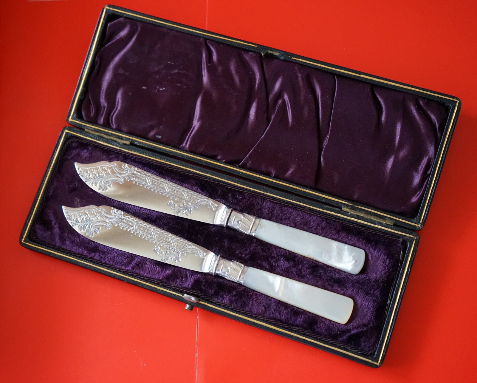 Boxed Pair of Ornate Silver Plated Mother of Pearl Knives - Collectable C.1900
