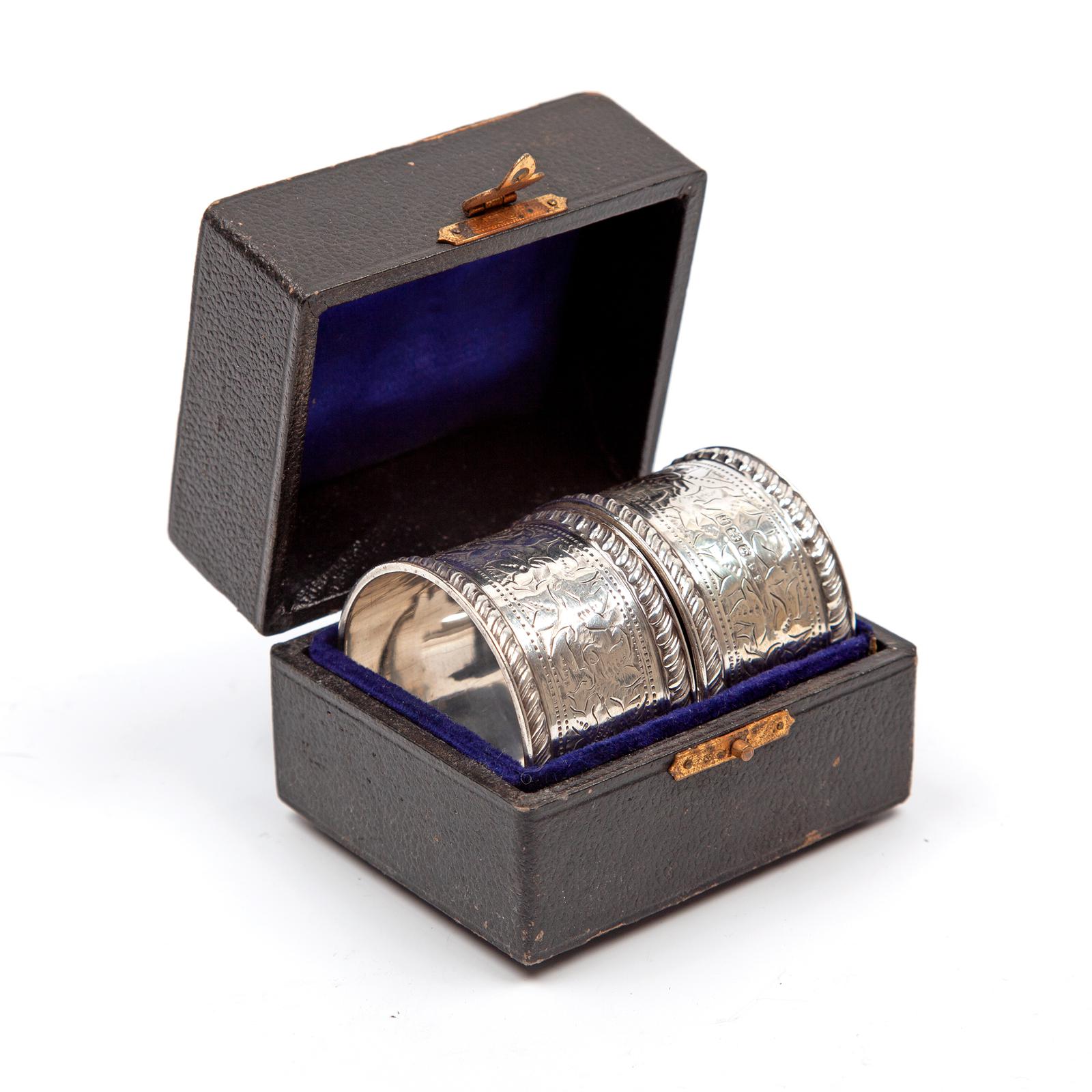 Boxed Pair of Silver Napkin Rings with Floral Engraving & Empty Cartouch