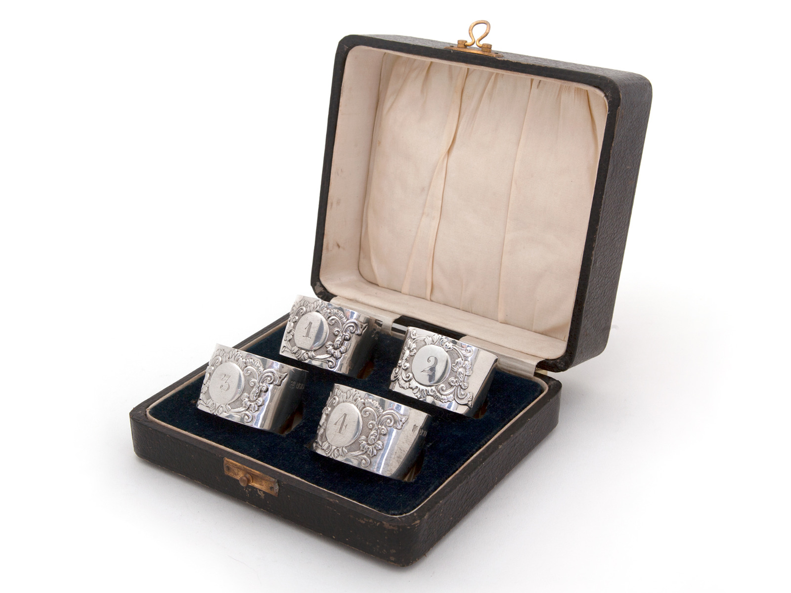 Boxed Set of Four Edwardian Numbered Silver Napkin Rings (1 of 1)