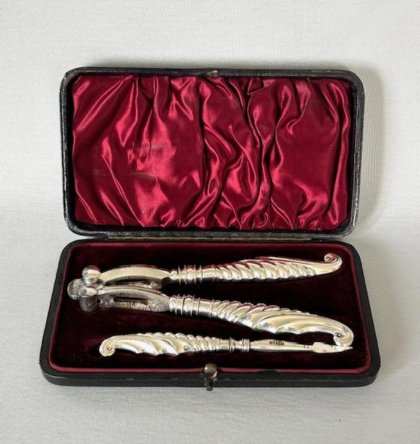 A most unusual boxed set of nutcrackers and nut pick, dating from the end of the Victorian era. The silver handles have a wrythen and scalloped design and are all fully hallmarked. The crackers and pick tool mechanisms are steel as silver is too soft to be effective. Presented here in the original fitted box, the set has an alternative use as a crab or lobster set. Both practical and decorative, these would make a lovely gift idea.