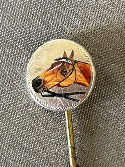 A rare Victorian silver stick pin featuring a disc finial, hand enamelled with a portrait of a racehorse within a dot engraved border.
