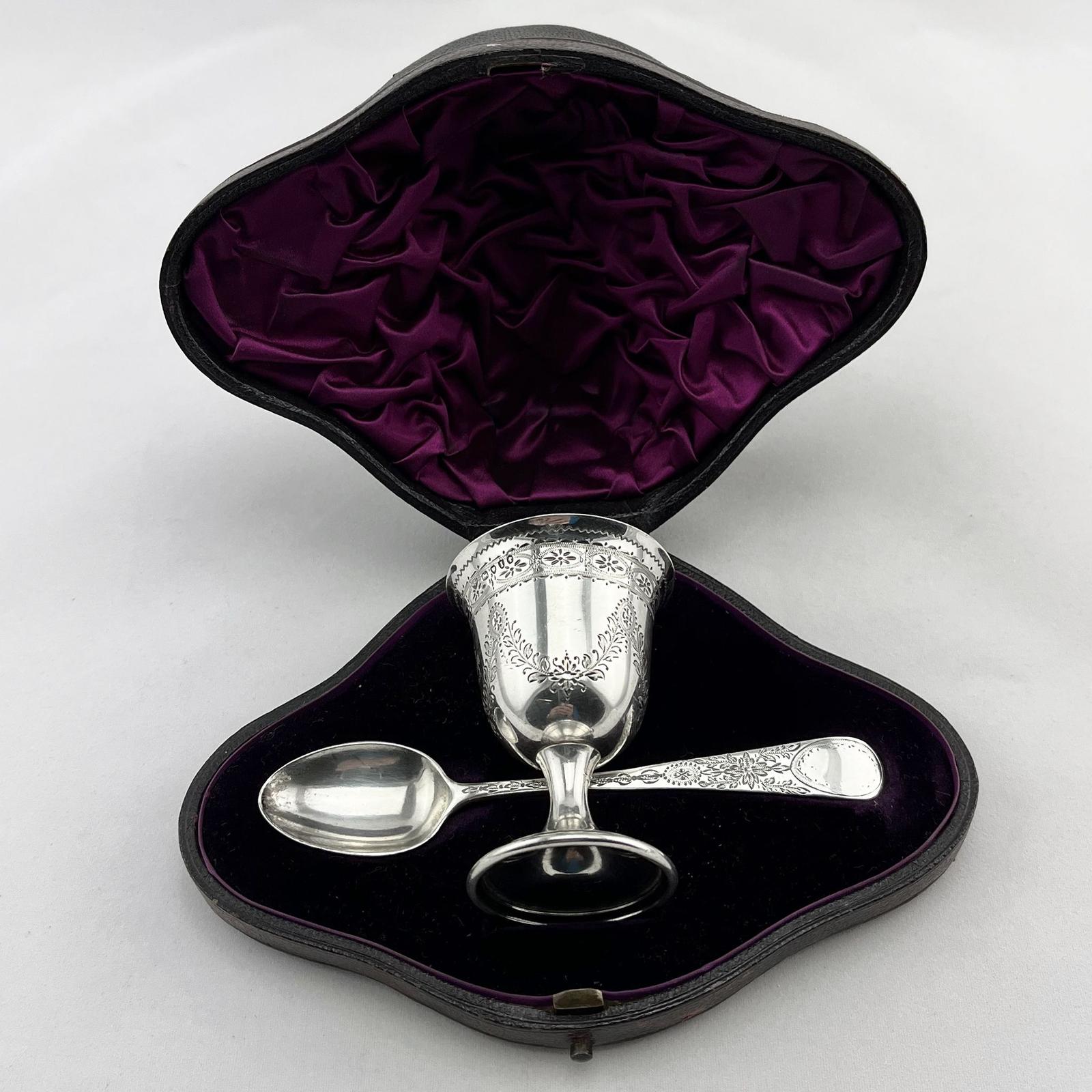 Boxed Victorian Sterling Silver Egg Cup & Spoon Christening Set