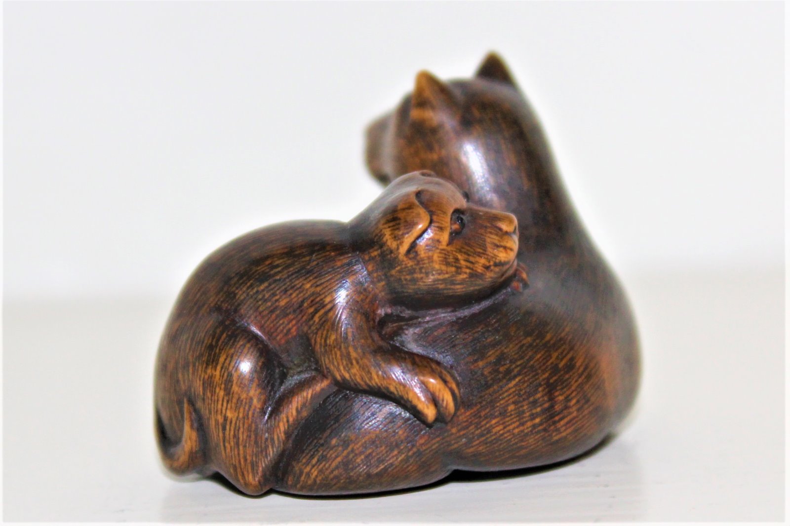 Boxwood Netsuke of Dog and Pup Signed Masanao