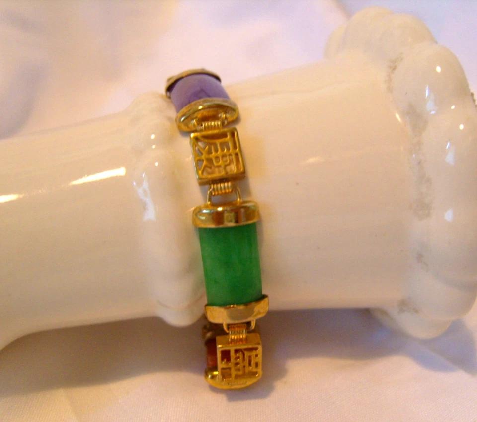 Fabulous Vintage 12ct gold plated (professionally tested) and multi coloured jade bracelet with Chinese symbols and feature 'Good Luck' clasp.