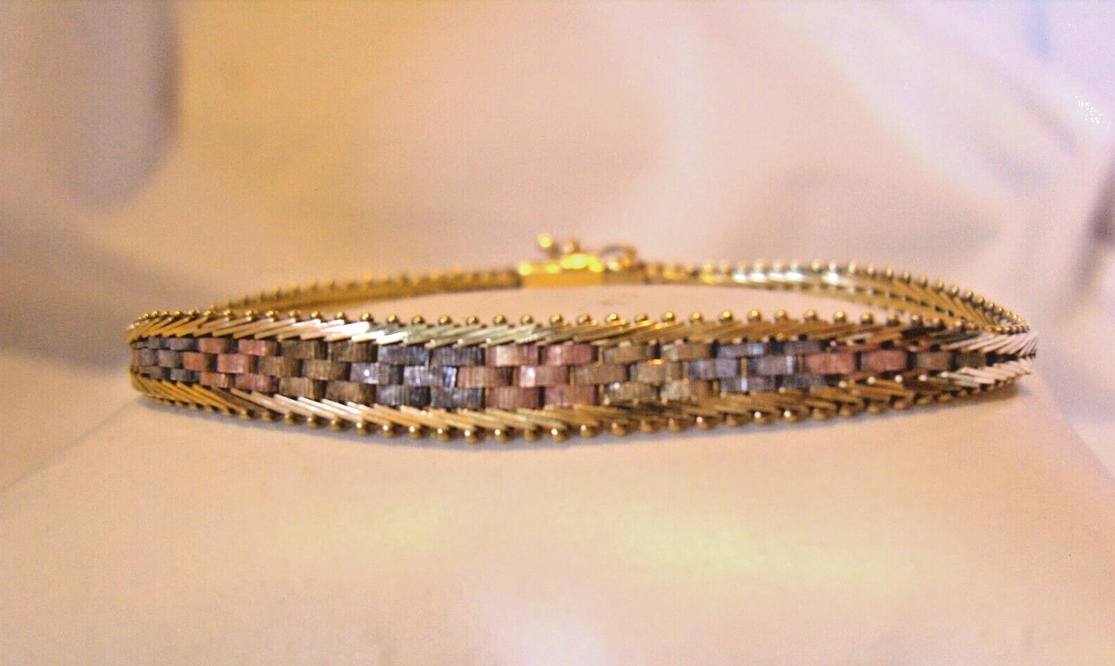 Bracelet 9ct Gold 375 Tri Gold Vintage 1980s Fancy Brick Link 7" Length 8.9g