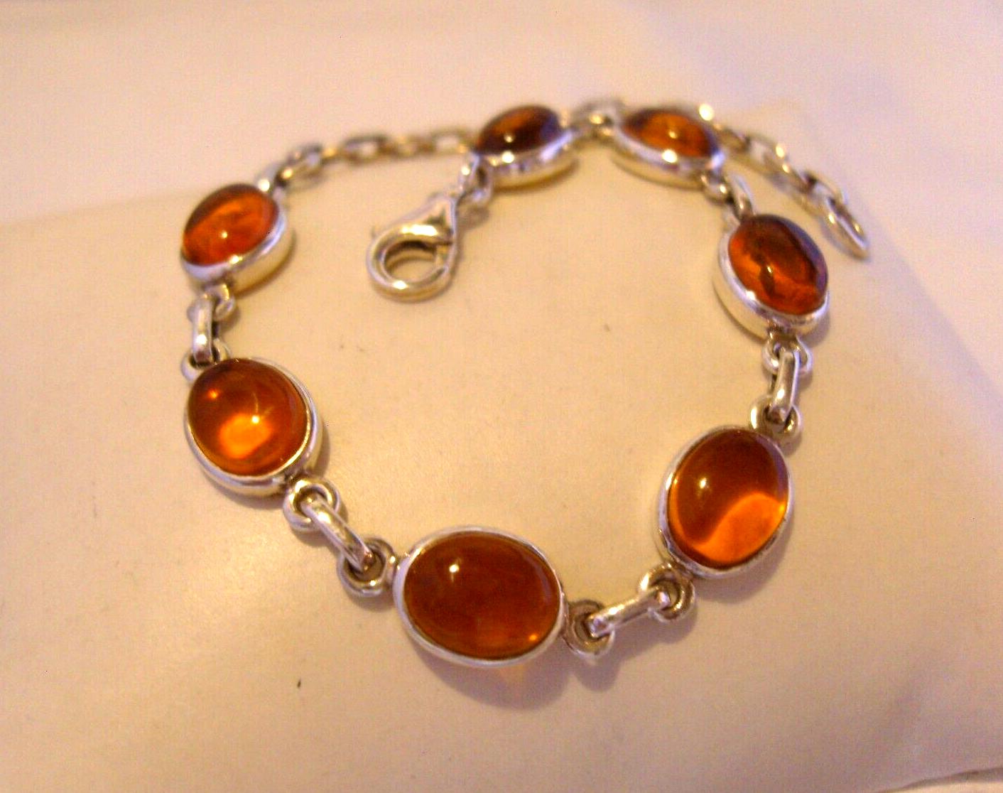 Bracelet Silver 925 & Amber Cabochons Vintage 1970s Adjustable 6" - 8 1/4"L